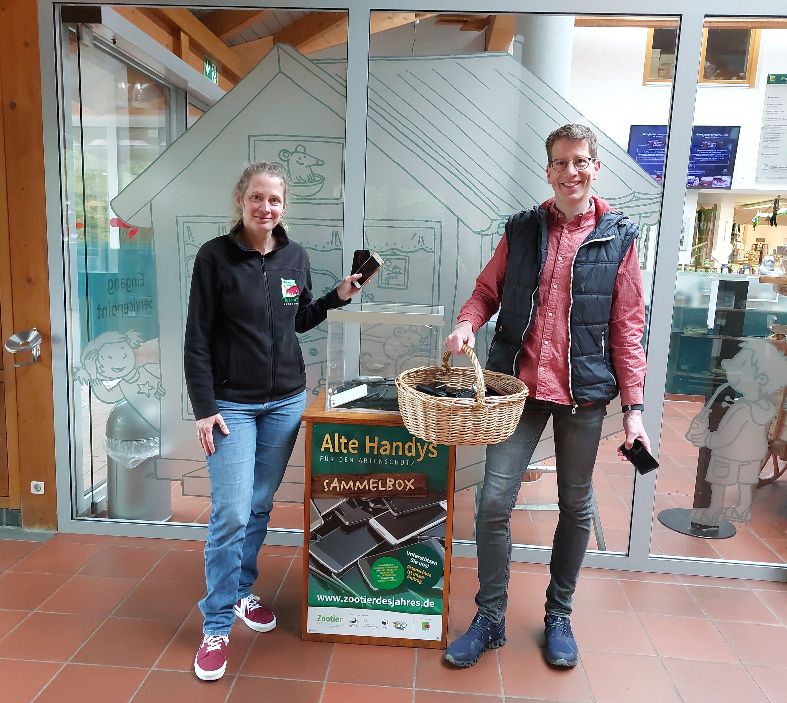 Foto (Tierparkarchiv): Jörg Voßkamp überreicht der Pressesprecherin des Tierparks, Ina Deiting, einen großen Korb mit Althandys.