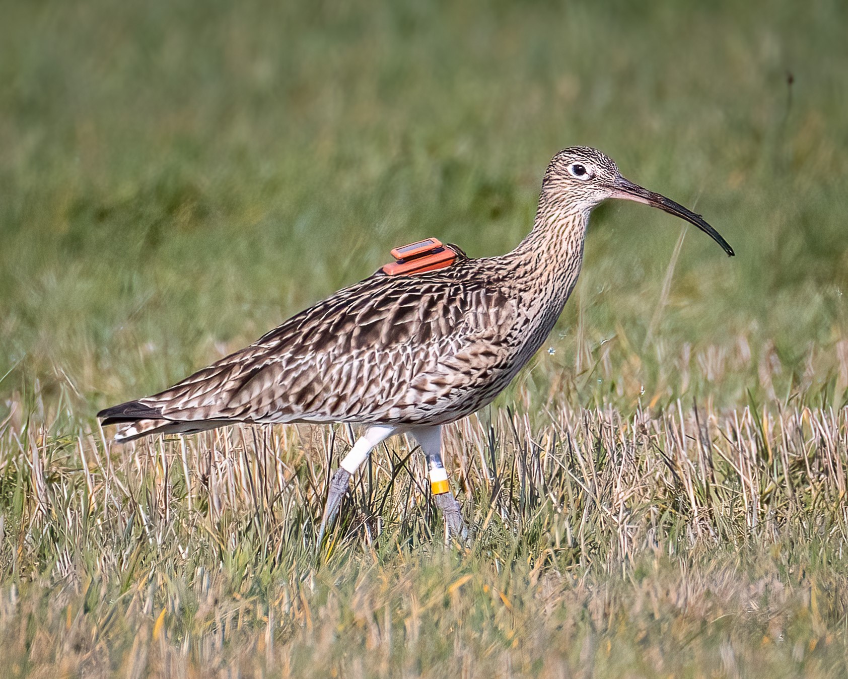 Foto (Thomas Berens): Ein ausgewachsener Brachvogel mit Rucksacksender streift am 19.02. 2023 auf der Suche nach Futter über das Grasland.