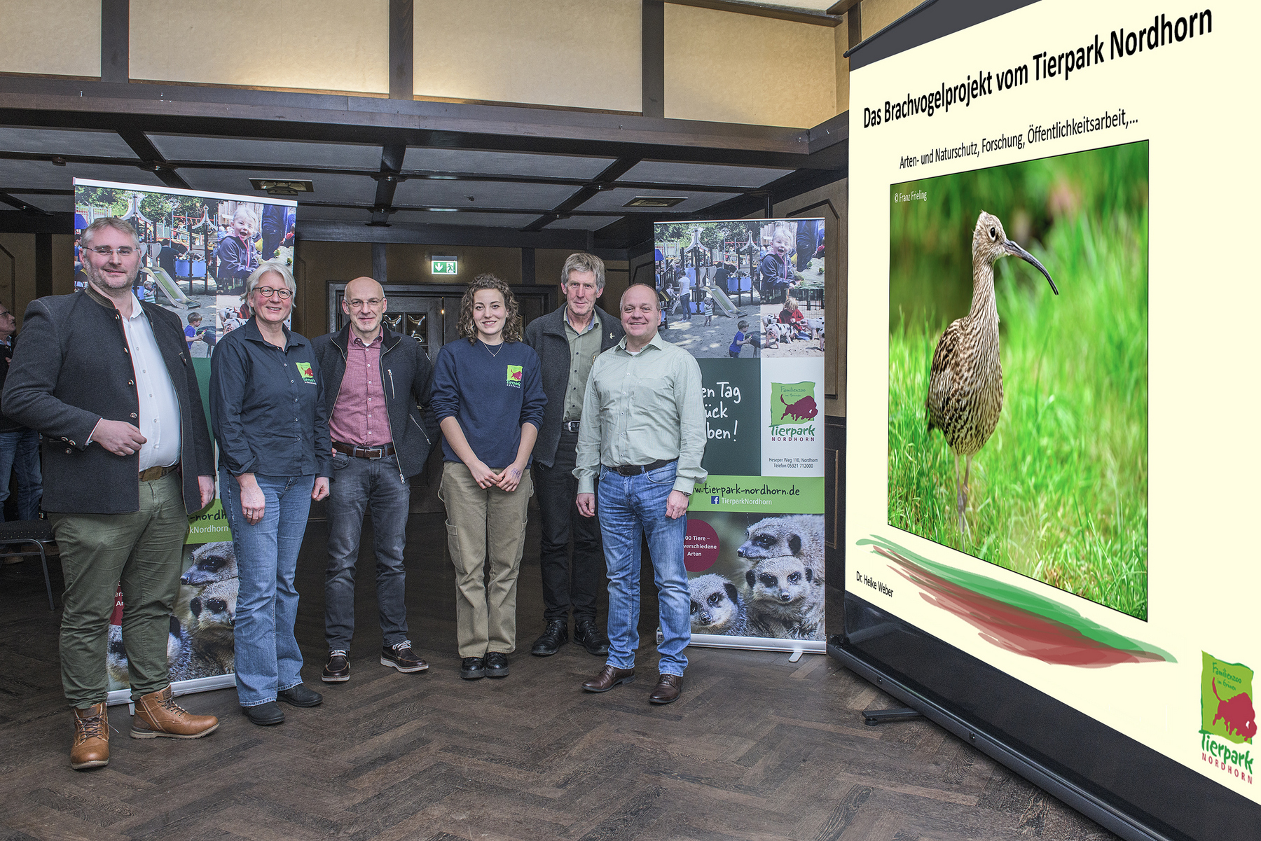 Um über die Ursachen und Maßnahmen zur Hilfe für den Brachvogel zu sprechen, trafen sich rund 60 Interessierte und Akteure Ende Januar im Tierpark Nordhorn zum 1. Brachvogelsymposium. Neben Informationen und dem gegenseitigen Austausch stand vor allem die Frage nach anwendungsbezogenen und praktikablen Lösungsansätzen im Vordergrund der Vorträge und Gespräche. Der gemeinsame Austausch und die Weiterentwicklung der Maßnahmen sind Ziel dieser Veranstaltung und werden auch unterjährig fortgesetzt. Der Schutz des Brachvogels als Schirmart hilft vielen weiteren Tierarten und verbessert ihre Lebensgrundlage.