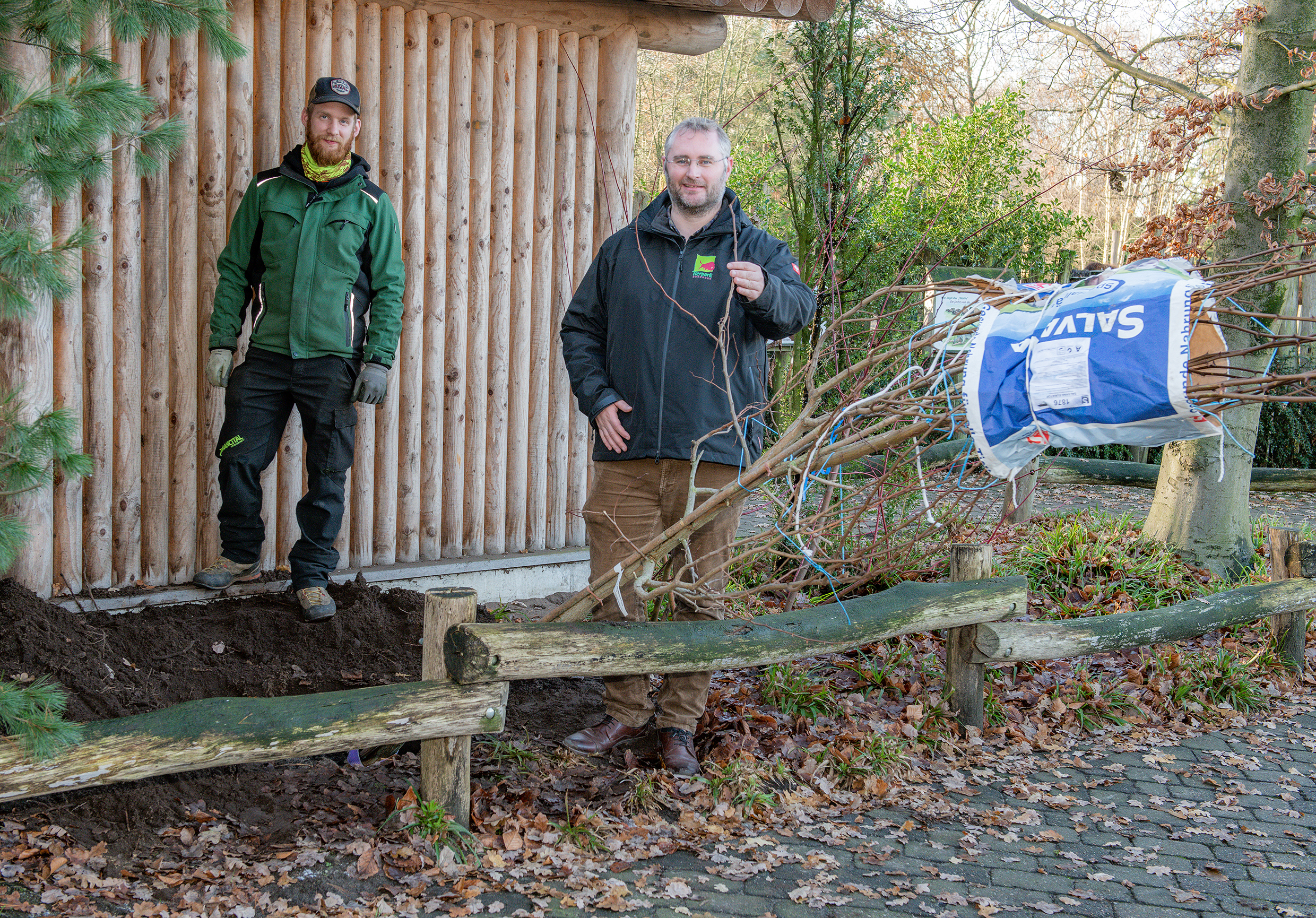 Im Vorfeld hatten Mitarbeiter des Tierparks eine Pflanzgrube ausgehoben, sodass Michael Surman und sein Mitarbeiter Sven Imperial die Robinie zügig an ihrem neuen Platz fachmännisch setzen konnten. Surmann ist im Emsland und der Grafschaft mit einem eigenen Unternehmen als Baumpfleger tätig und hat den Baum in diesem Jahr gestiftet. Charakteristisch für die gepflanzte Robinie der Sorte Frisia ist ihr gold-gelbes Laub, dass ihr auch den Namen Gold-Robinie eingebracht hat.