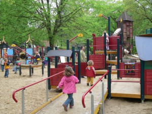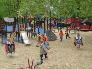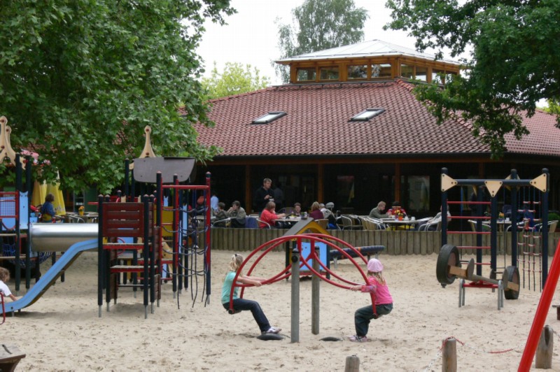 Mitten im Park befindet sich der Sammelpunkt vieler Familien. Die Kombination mit großem Spielplatz, Streichelzoo und angrenzender Cafeteria ist vor allem eine Einladung an Familien und Gruppen mit Kindern.