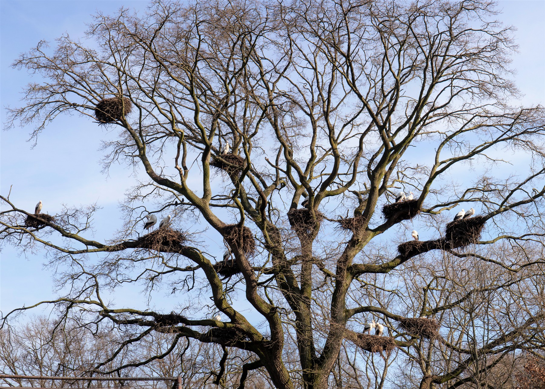 In der Grafschaft Bentheim sind es aktuell 46 Brutpaare. Einen besonderen Anteil an der guten Bestandsentwicklung in der Grafschaft Bentheim haben die Störche bei uns im Tierpark. Bei Storchenliebhabern sehr bekannt ist die mächtige Storcheneiche, in der ein Großteil der Nester zu finden ist.