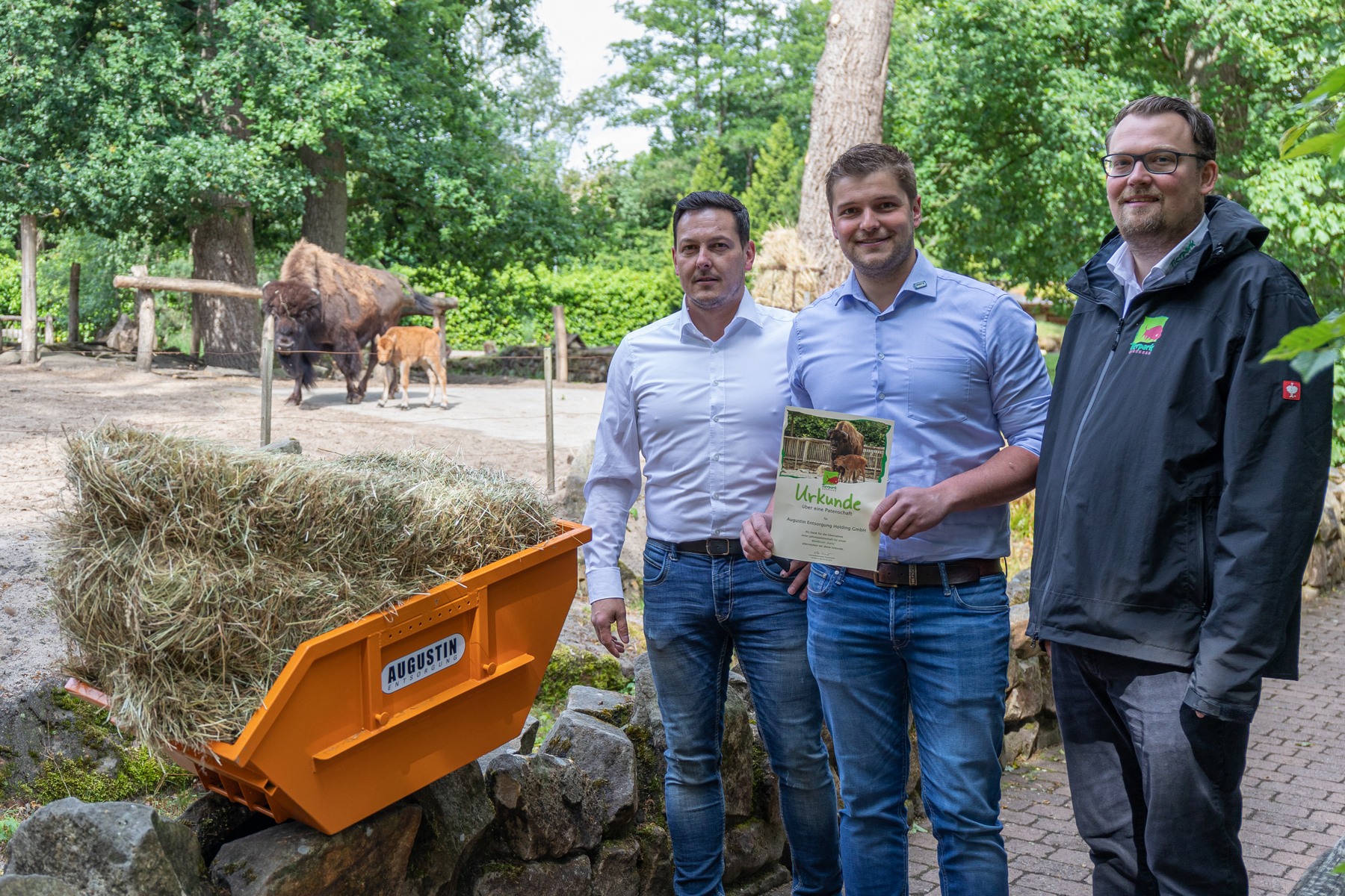 Foto: Lukas Augustin (Bildmitte: 4. Generation in der Augustin Gruppe) und Mike Kleinat (Betriebsleiter Theo Augustin Städtereinigung GmbH & Co.KG-Nordhorn) und Nils Schleper (stellv. kaufmännischer Leiter Tierpark Nordhorn) am Bisongehege mit Patentier „Karla“ im Hintergrund