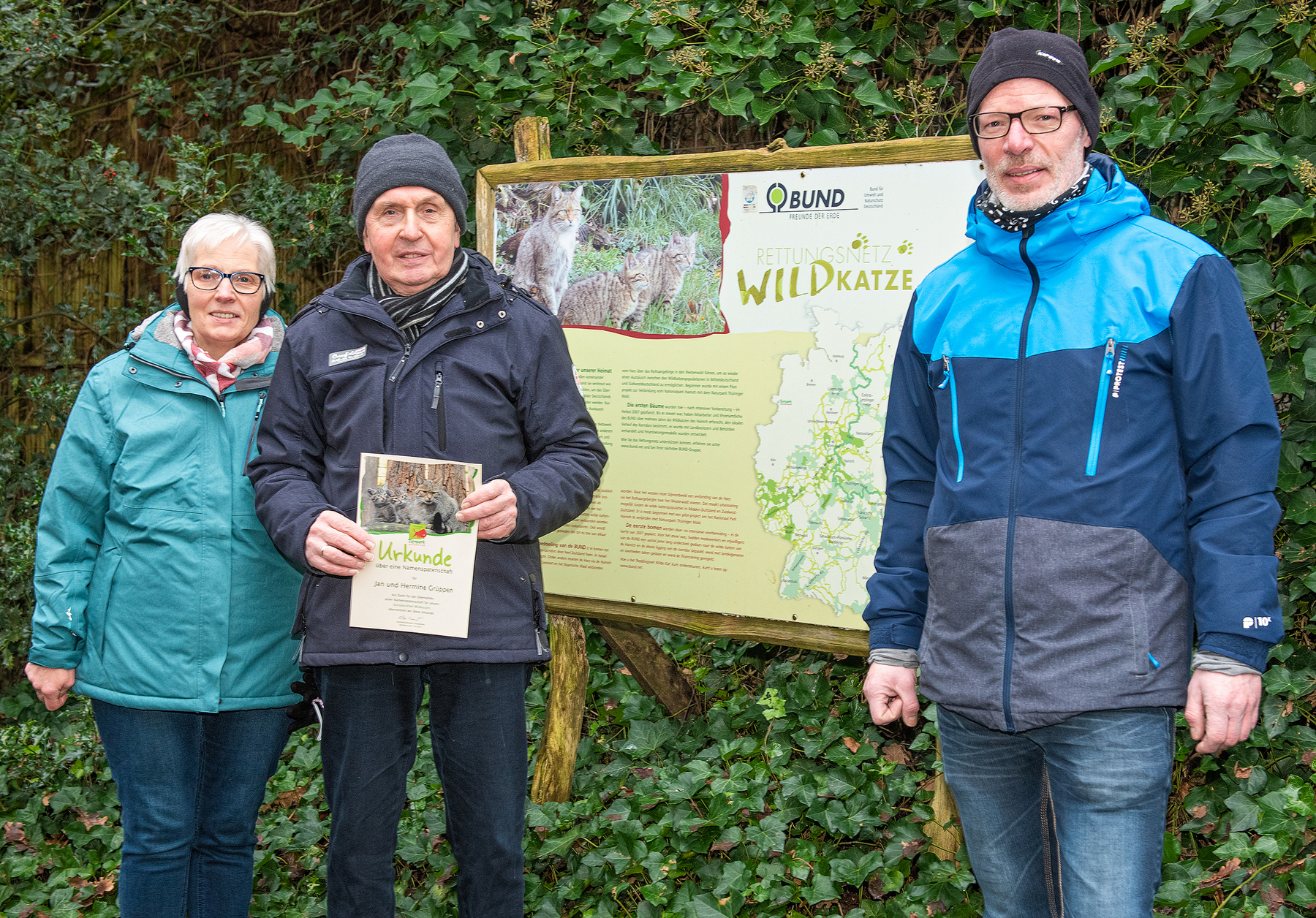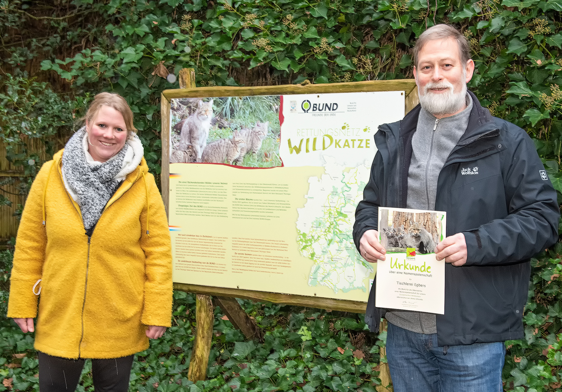 Da die Krise weiter andauert und der finanzielle Verlust mit jedem Tag Schließung größer wird, ruft der Förderverein nun wieder verstärkt zu Hilfsaktionen auf. Unter „#wirsindzoo – Gemeinsam mit dem Tierpark“ finden sich verschiedene Möglichkeiten den Verein und damit den Zoo zu unterstützen. Dass sich die Unterstützung mitunter lohnt, konnten aktuell zwei der Neumitglieder erfahren. Unter den Neumitgliedern des Jahres 2020 wurden zwei Jahrespatenschaften für die Europäischen Wildkatzen verlost. Die glücklichen Gewinner durften jeweils einem der im vergangenen Jahr geborenen Jungtiere einen Namen geben. Hermine und Jan Grüppen gaben der weiblichen Katze den Namen „Kira“. Der kleine Kater wurde von den Mitarbeitern der Tischlerei Egbers aus Osterwald auf den Namen „Karlo“ getauft. In der vergangenen Woche nahmen die Neupaten ihre Urkunden von den Vorsitzenden Dietmar Brookmann und Jenny Nienaber entgegen.