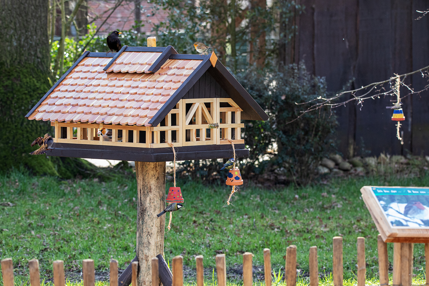 Im Tierpark Nordhorn kann man sich natürlich Tiere in ihren Gehegen anschauen, doch der Familienzoo ist bekannt dafür, dass er sehr viel Wert darauf legt den Besuchern die heimische Tierwelt näher zu bringen. Daher wurde kürzlich als weitere Attraktion eine Station zur Ganzjahresfütterung von Wildvögeln installiert: Ein handgearbeitetes Vogelhaus im XXL-Format wurde neben dem Mäusehaus aufgestellt. Die Größe des Vogelhauses ermöglicht es vielen Vögeln zeitgleich zu fressen. Das Fachwerk dieses Hauses sorgt dafür, dass kleine Singvögel an Körner, Rosinen, Insekten und Nüsse gelangen können, aber keine großen Vögel wie Tauben und Elstern oder auch die vorwitzigen Eichhörnchen.