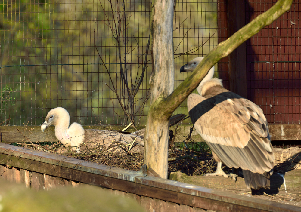 Die Gänsegeierhaltung im Tierpark Nordhorn hat schon eine sehr lange Tradition. Seit vielen Jahren teilen sich die stattlichen Greifvögel eine nachgebaute Felslandschaft, den sogenannten „Geierfelsen“, mit Sibirischen Steinböcken, Waldrappe und Europäischen Sumpfschildkröten. Immer wieder haben einige der Geier zusammen ein Nest gebaut, ein Ei gelegt und manchmal auch erfolgreich ein Jungtier ausgebrütet und aufgezogen – aber so wie es im Normalfall sein sollte, war es im Familienzoo eigentlich nie. In der Regel bilden Gänsegeier nämlich feste Paare die dann über Jahrzehnte hinweg zusammenbleiben. Jedes Jahr zur Brutzeit sitzen diese Paare eng beieinander, beknabbern sich mit den Schnäbeln und bauen gemeinsam ein Nest. Dabei sind die Nester von Geiern nichts so groß und beeindruckend wie beispielsweise die von Störchen. Geiernester bestehen meist nur aus ein paar Zweigen und Holzstückchen in einer geschützten Felswand.