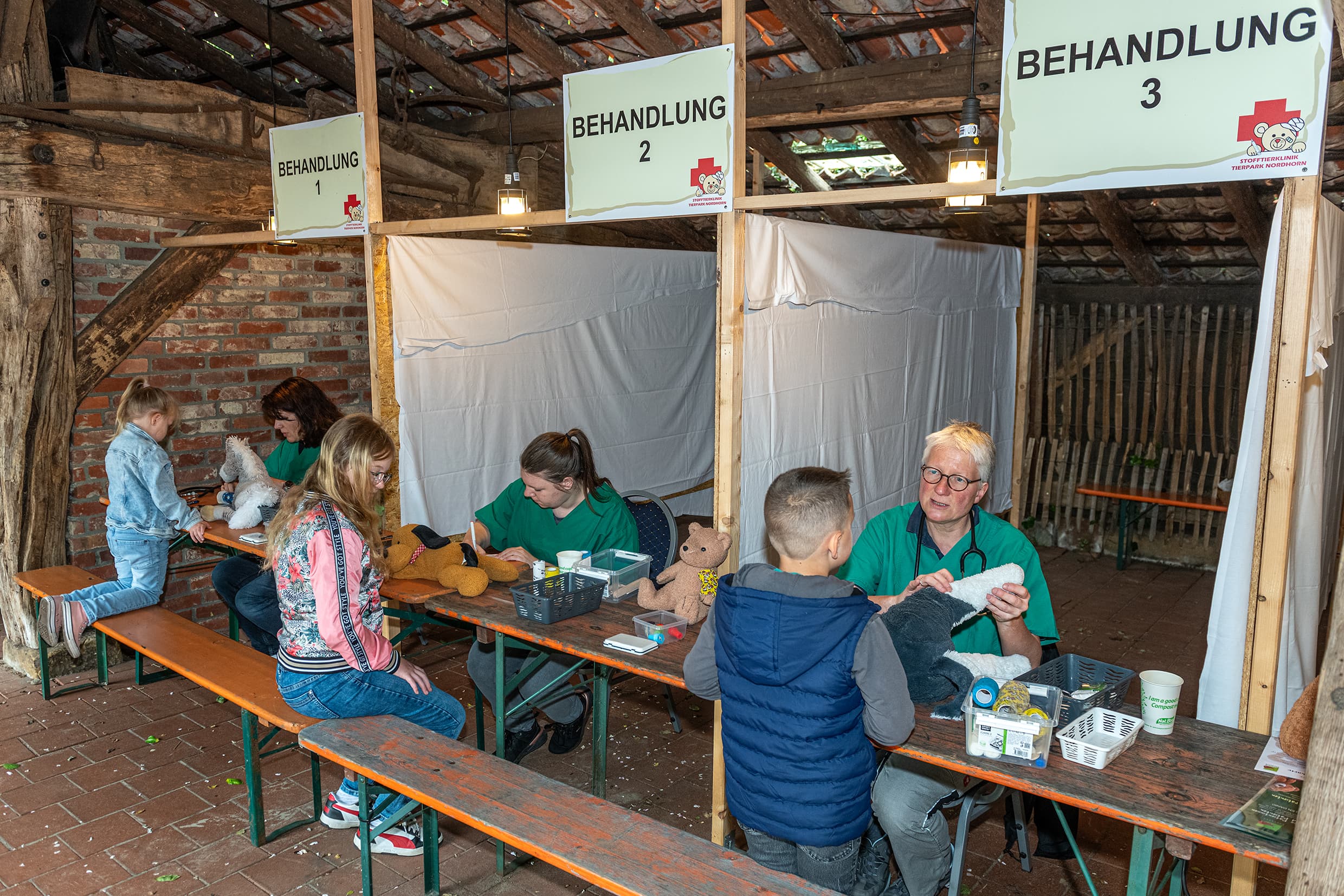 Auch in diesem Jahr werden Kinder- und Imkertag mit der Stofftierklinik gekoppelt. In der Treckerremise können Kinder von 10 bis 17 Uhr ihre kleinen und großen Stofftiere den Stofftierärzten vorstellen und sie wie in einer richtigen Klinik untersuchen lassen. Egal, ob der pelzige Begleiter Bauchschmerzen hat, oder ein gebrochenes Bein – die Ärztinnen und Ärzte haben in der Stofftierklinik für alle Beschwerden eine Lösung parat. Dabei läuft alles wie in einer echten Tierarztpraxis ab: Für kleinere Notfälle, sprich arg in Mitleidenschaft gezogene Kuscheltiere, steht sogar ein „OP“ bereit. Mit Pflastern, Spritzen und Verband behandelt und mit Medikamenten versorgt, geht es Teddy & Co. dann sicher schnell wieder besser. Auf der oberen Vechtewiese werden zudem die Polizei, die Feuerwehr, der Malteser Hilfsdienst und die Rettungshundestaffel Grafschaft Bentheim ihre Arbeit kindgerecht vorstellen. Auch der Bereich der großen unteren Vechtewiese ist an diesem Tag mit Leben gefüllt: Hüpfburgen für kleine und größere Kinder und Ponyreiten – hier kommt keine Langeweile auf. Der Förderverein des Tierparks sorgt zudem in diesem Jahr wieder mit der beliebten Schokokussmaschine für Unterhaltung und an der Vechtehofremise können Kerzen gezogen werden.