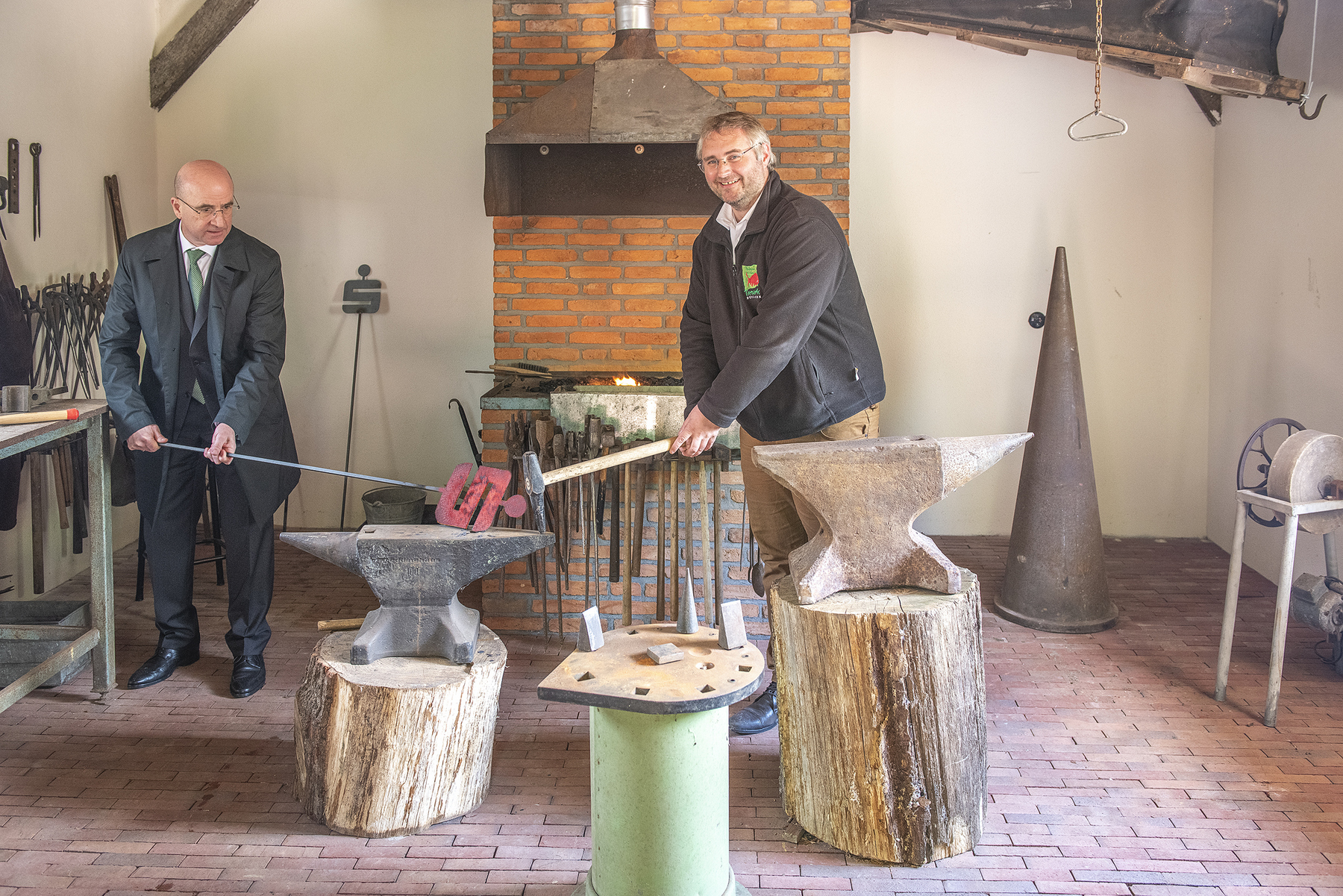 Hubert Winter nahm dieses dankend entgegen und sagte: „Ich bin immer gerne im Tierpark und freue mich, dass wir als Sparkassenstiftung mittlerweile an so vielen Stellen im Zoo an der Realisierung der Projekte so großen Anteil hatten! Die 70.000 Euro für die Schmiede waren ein doppeltes Geburtstagsgeschenk – zum 25jährigen Jubiläum der Stiftung und dem 70. Geburtstag des Tierparks in 2020.“