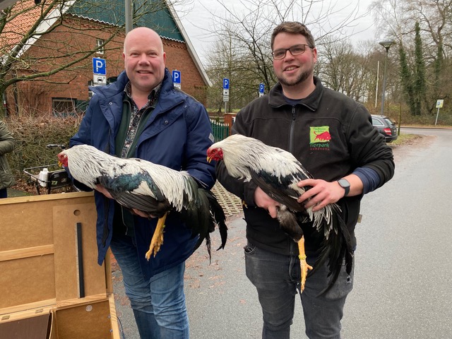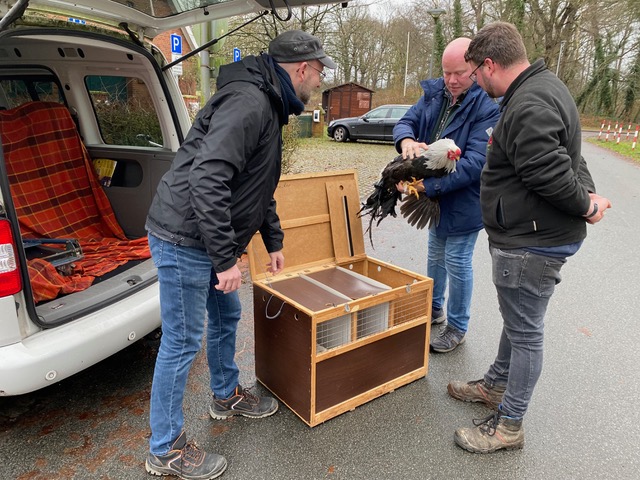 Du kennst das sicher noch aus der „Coronazeit“. Da mussten erkrankte Menschen auch in Quarantäne. Das heißt, sie mussten zuhause bleiben, niemand durfte sie besuchen, sie bekamen Medikamente und sollten sich viel die Hände waschen. Aber wer kräht denn da nun so keck in der Quarantänestation Bleeker? Das ist der neue Kraienkopp-Hahn, den der Zoo von einem Züchter gekauft hat. Damit der stolze Hahn als Gruppentier nicht alleine die Quarantänezeit durchstehen muss, hat er zwei Hennen aus dem Zoo als Partnerinnen bekommen. Die Dreiergruppe wird nun einige Wochen im Hof Bleeker zusammenleben. In dieser Zeit beobachten die Tierpfleger ganz genau, ob der Hahn gut frisst, gesund bleibt und wie sein Kot aussieht. Zudem untersuche ich als Zootierärztin die Tiere und auch deren Kot. Finden sich Krankheitserreger, so kann ich Medikamente dagegen geben. Nach Ende der Quarantänezeit können wir ziemlich sicher sein, dass alle drei gesund sind. Der neue Hahn kann dann endlich mit seinen zwei Partnerinnen in den Zoo umziehen. Und wohin genau? Natürlich zum Vechtehof, wo die restlichen 11 Hennen schon auf ihre zwei „Gruppen-Freundinnen“ und den schicken neuen Hahn warten.