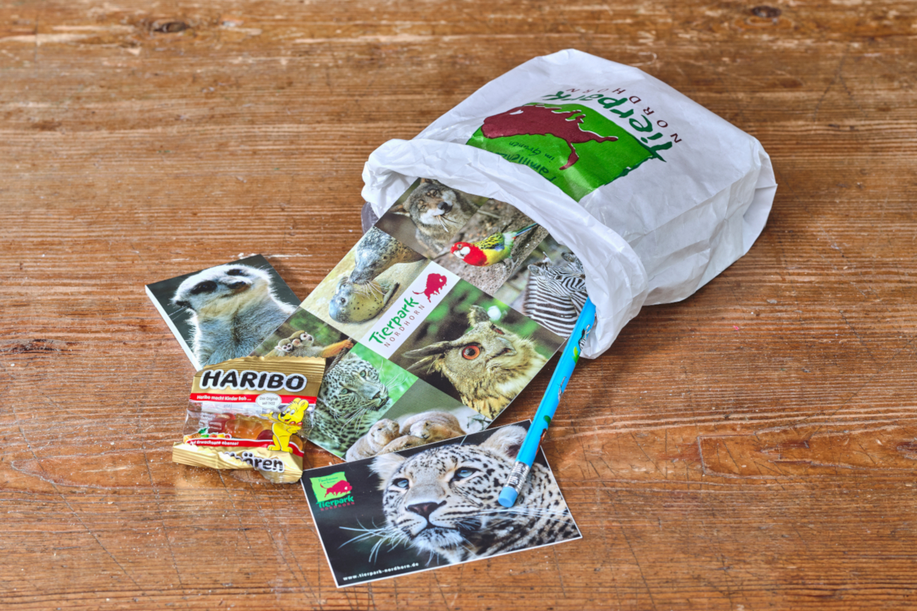 Eine Give-away Tüte aus dem Tierpark Nordhorn hält den Kindergeburtstag im Familienzoo bei allen Gästen in guter Erinnerung. Gerne bereiten wir für alle Kinder Give-away Tüten für den Rückweg vor. Die Tütchen kosten 7,00 €/ Stück.- Beispiel Give-Away-Tüte