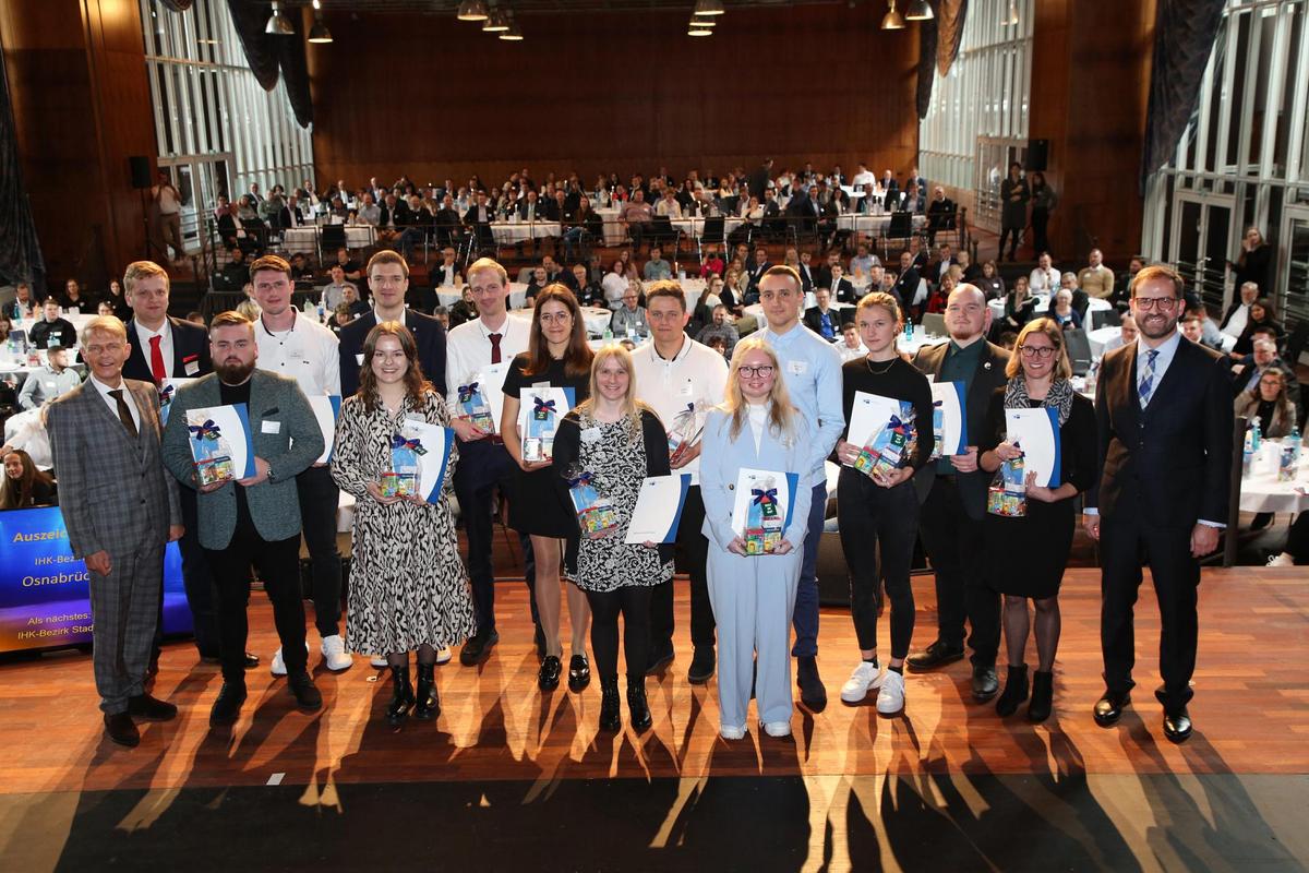 Gruppenfoto: Dr. Brons (links, IHKN-Präsident) und Hr. Deinhard (rechts, IHKN-Hauptgeschäftsführer) mit den 14 Landesbesten Auszubildenden aus dem IHK Bezirk Osnabrück/Emsland/ Grafschaft Bentheim. Julis Schuhwerk (2. von rechts) wurde als einzige Auszubildende aus dem Landkreis Grafschaft Bentheim ausgezeichnet.