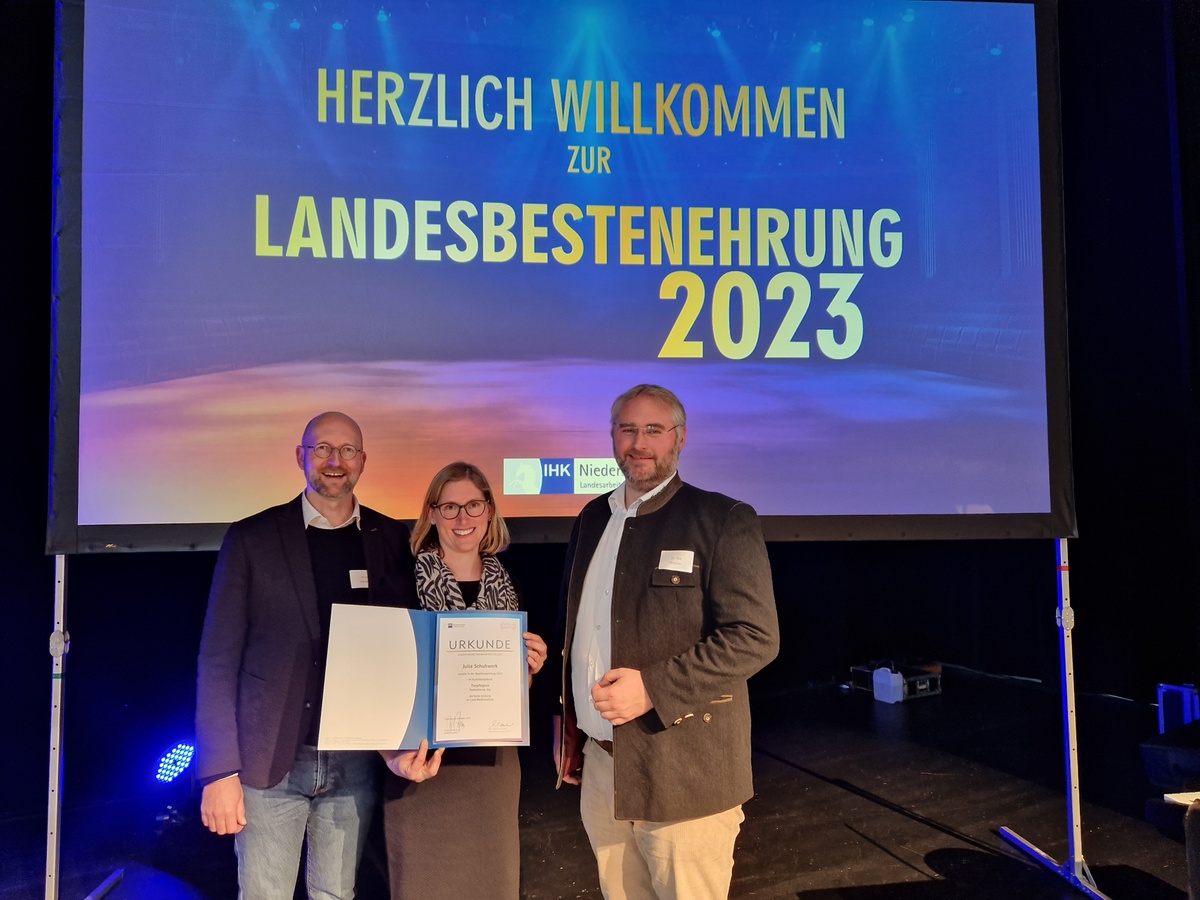 „Die beste Leistung im Land Niedersachsen“ steht schwarz auf weiß auf der Urkunde, die eine stolze Julia Schuhwerk in der Hand hält. Die Auszubildende zur Tierpflegerin Fachrichtung Zoo aus dem Tierpark Nordhorn wurde am vergangenen Donnerstag im Rahmen der Landesbestenehrung 2023 der IHK Niedersachsen im Beisein ihrer Familie und den Vertretern des Tierpark Nordhorn geehrt. Kultusministerin Julia Willie Hamburg und IHKN-Präsident Dr. Bernhard Brons stellten den Wert guter betrieblicher Ausbildung in den Mittelpunkt ihrer Reden und machten den Auszubildenden Mut für ihren weiteren Lebensweg.