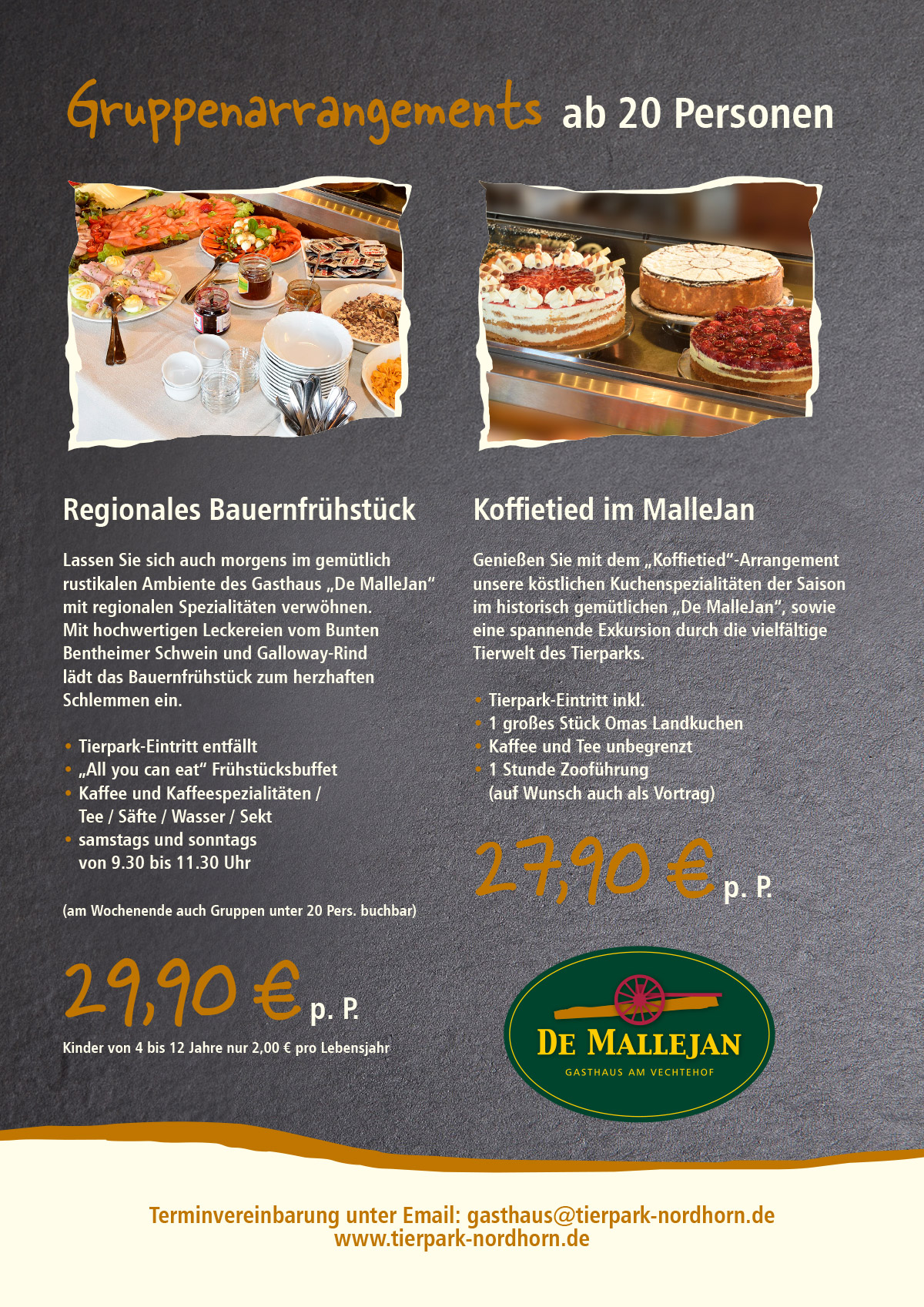 Genießen Sie mit dem „Koffietied“ – Arrangement unsere köstlichen Kuchenspezialitäten der Saison im historisch gemütlichen Gasthaus „De MalleJan“, sowie eine spannende Exkursion durch die vielfältige Welt des Tierparks (Auf Wunsch auch als Vortrag). Montag bis Sonntag. Ab 20 Personen.