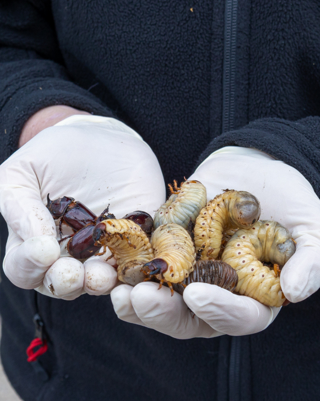 Günther Tüchter aus Emlichheim fand die großen Larvenstadien der Käfer im Pferdemisthaufen auf dem Grundstück seiner Tochter und schickte uns Fotos. Als regionales Arten- und Naturschutzzentrum betreiben wir im Tierpark Nordhorn eine Auffangstation für bedrohte Wildtiere. Wir erhalten nicht nur Anfragen bezüglich verletzter Wildtiere, sondern auch Meldungen über gefundene exotische oder „unbekannte“ Tiere, wie die Käferlarven. Unsere Kuratorin Dr. Heike Weber konnte schnell feststellen, dass es sich bei den Insekten um Larven des geschützten Nashornkäfers (Oryctes nasicornis) handelt. Da der Pferdemist auf dem Feld ausgebracht werden sollte, hätte dies das Ende für die Käferlarven bedeutet. In Absprache mit der Unteren Naturschutzbehörde des Landkreises und in Zusammenarbeit mit dem NABU Grafschaft Bentheim haben wir die Larven sowie zusätzlich gefundene Käferstadien umgesiedelt. Sie kamen zur „Weißen Riete“, einer Naturstation des NABU in Schüttorf. Hier wurden vor einigen Jahren, an einen Waldstreifen angrenzend, zwei Käfermieten angelegt. Eine davon war noch unbesetzt und bot sich als perfekter Standort für die Nashornkäfer an.