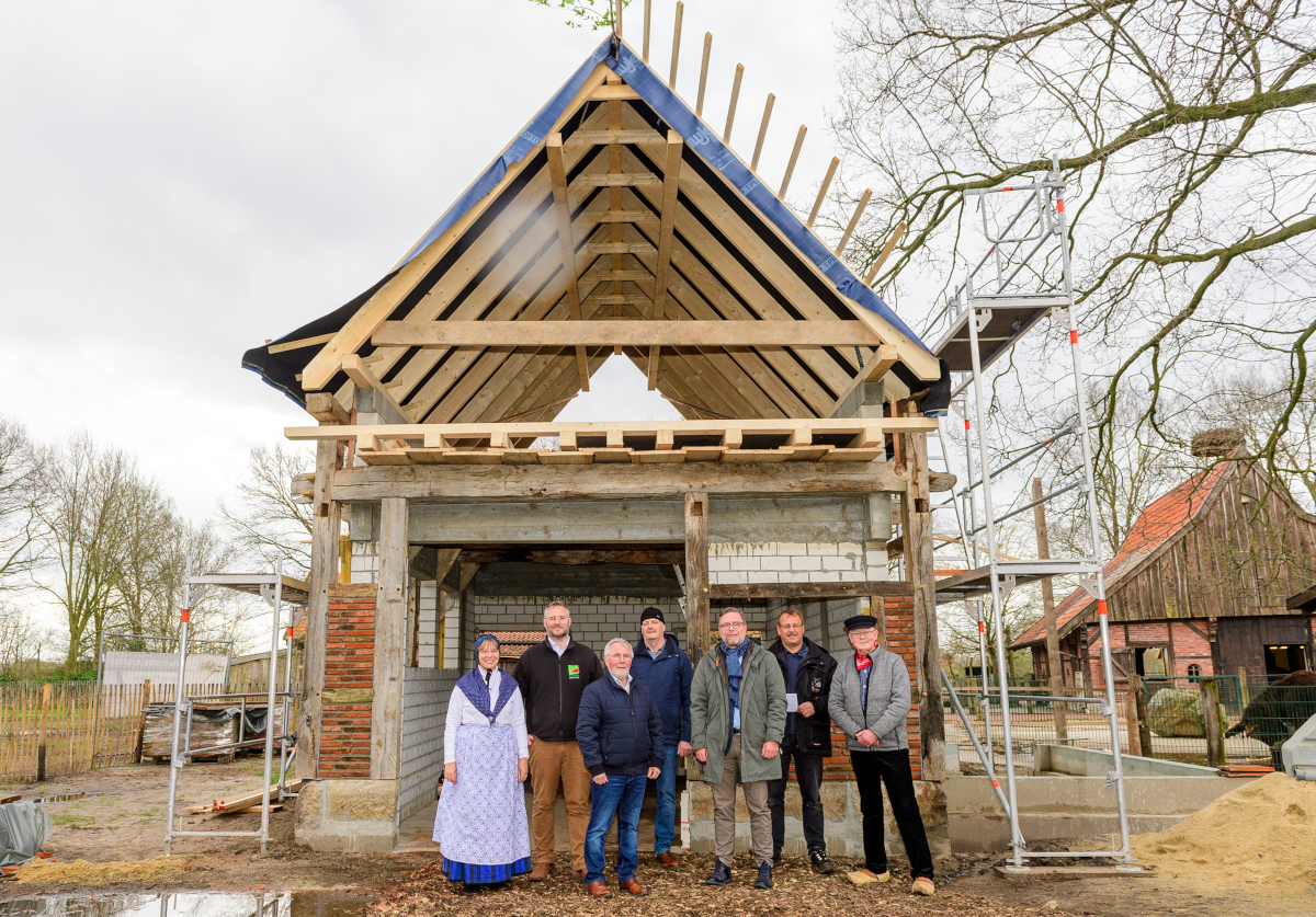 Mit der historischen Schmiede und der Dorfmetzgerei sind innerhalb eines Jahres drei Gebäude im sogenannten Vechtedorf im Tierpark Nordhorn eröffnet und mit Leben gefüllt worden. Nun stand das Richtfest eines weiteren Gebäudes an und wurde im Familienzoo in kleinem Rahmen feierlich von Zooleitung, Handwerkern und Sponsoren begangen.