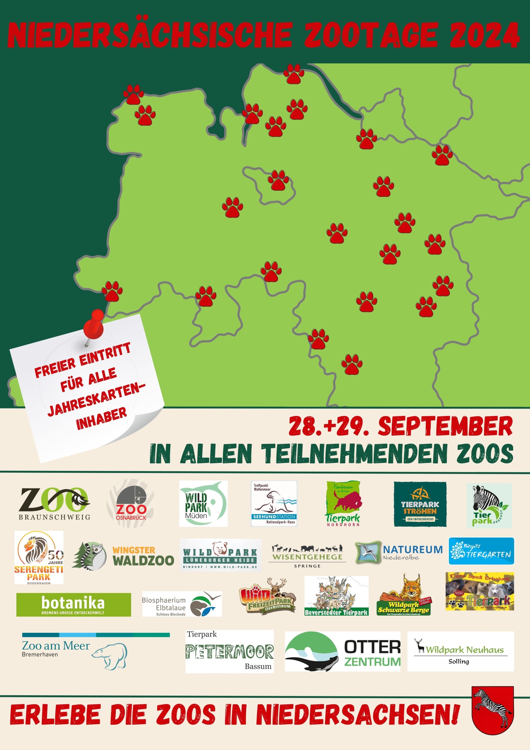 Nach dem großen Erfolg im letzten Jahr veranstalteten die zoologischen Einrichtungen in Niedersachsen am 28. und 29. September 2024 bereits zum zweiten Mal die „Niedersächsischen Zootage“. Am letzten Septemberwochenende erhielten Jahreskarteninhaber eines niedersächsischen Zoos auch in den anderen teilnehmenden Zoos im Land freien Eintritt und konnten sich so einen Überblick über die Arbeit der Zoogemeinschaft verschaffen. Sehr viele der tausenden Dauerkarteninhaber nutzten diese Gelegenheit und strömten in die Zoos. Von der Küste bis zum Harz, von der niederländischen Grenze bis vor die Tore Hamburgs konnten verschiedene Zoos, Tierparks, Wildparks und Co besucht werden. Insgesamt 23 Einrichtungen in Niedersachsen und Bremen haben dieses Jahr daran teilgenommen.