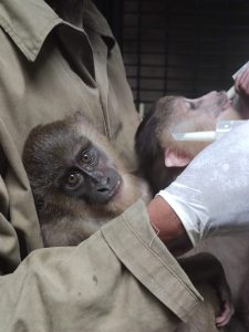 Der erfahrene Tierpfleger Kili Matute in der Quarantäne versorgt sie vorbildlich und sie entwickelt sich prächtig. Inzwischen wiegt sie bereits über 2 kg und bekommt nur noch 3x täglich je 120 ml Milch.