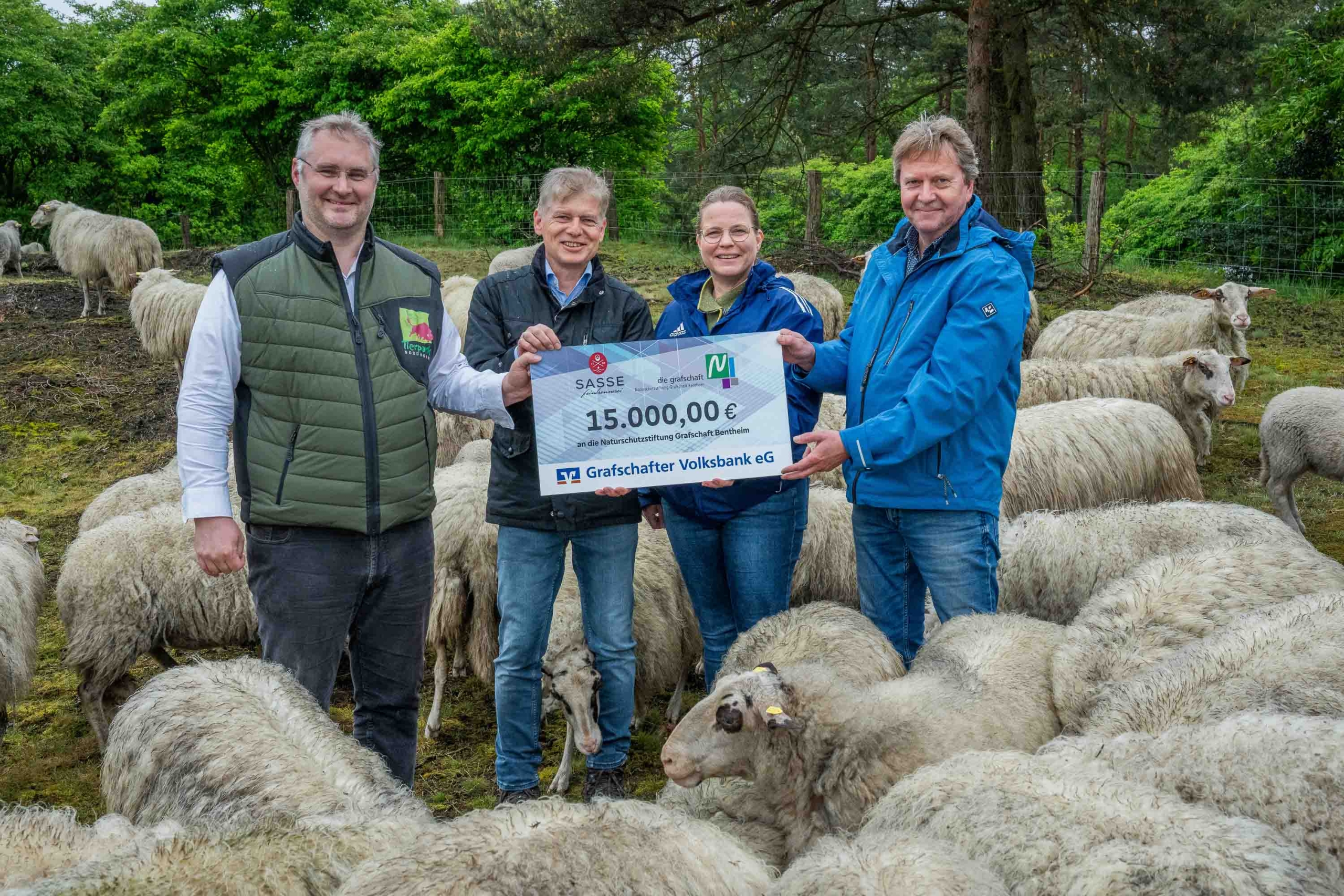 Höhepunkt des Schafauftriebs war die Scheckübergabe der Feinbrennerei Sasse, die von Geschäftsführer Rüdiger Sasse höchstpersönlich vorgenommen wurde. Die Feinbrennerei aus Schöppingen unterstützt die Naturschutzarbeit in diesem Jahr mit einem Betrag von 15.000 Euro. Das Geld fließt in einen Sonderfond der Naturschutzstiftung und soll zum Erhalt der wertvollen Naturschutzlandschaften in der Region beitragen. Von jedem verkauften Liter „Grafschafter Kräuterwacholder“ der Feinbrennerei Sasse fließt jeweils ein Euro in die Naturschutzarbeit. Die Mitarbeiter des Tierparks sammeln regelmäßig die Wacholderbeeren für den Kräuterwacholder in den Grafschafter Naturschutzgebieten.