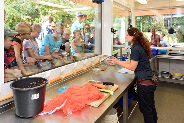 Der „Blick hinter die Kulissen“ ist seit jeher eines der faszinierendsten Themen, mit denen Besucher für die Arbeit im Zoo und das Unternehmen Zoo begeistert werden können. So hat der Familienzoo bei der Planung einer neuen Futterküche diese kurzerhand in den Park gerückt und lässt seit dem Jahr 2015 seine Besucher an diesem zentralen Gebäude und der darin stattfindenden Arbeit teilhaben. Rund um die neue Schau-Futterküche wurden auf Infotafeln und in Lernspielen Themen wie Futtermengen und Futterqualität, Nahrungskreisläufe und Tierbeschäftigung spielerisch behandelt.