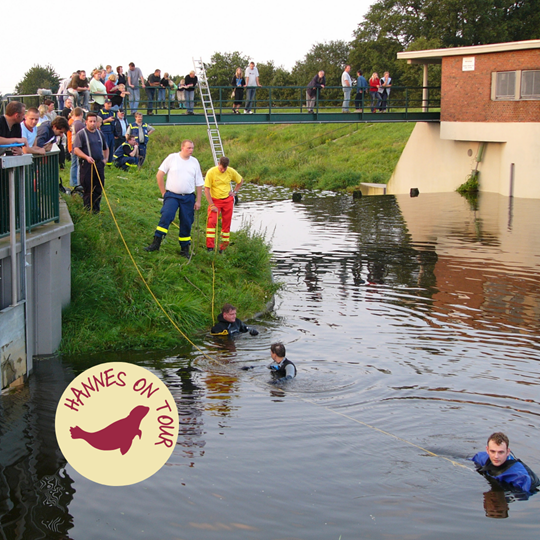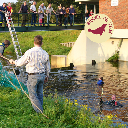 Der damalige Tierparkleiter Thomas Berling hatte vor 20 Jahren direkt die Vermutung, dass der ausgebüxte Seehund Hannes möglicherweise über den Altarm in die Vechte oder sogar in den Vechtesee gelangt sein könnte. Mit einigen Mitstreitern startete daher am selben Tag eine Suche per Boot. Zunächst erfolglos, aber seine Befürchtung wurde nur einen Tag später bestätigt: Hannes wurde von Anglern am Vechtewehr in Neuenhaus entdeckt. Über 120 Helfer versuchten vergeblich, den kleinen Ausreißer einzufangen. Auch der Einsatz von Tauchern brachte keinen Erfolg, da sich der schlaue Seehund immer wieder geschickt entziehen konnte. Erst fünf Tage nach seinem Ausbruch konnte Hannes schließlich in den Niederlanden eingefangen werden. Er wurde in das „Zeehondencréche Pieterburen“ gebracht, eine Auffangstation für junge Seehunde.