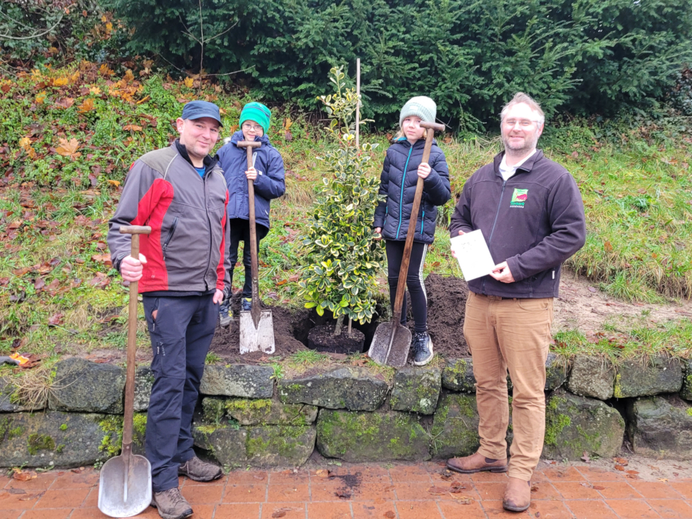 Zum Ende dieses Jahres hat die Regionalgruppe Emsland-Grafschaft Bentheim der Deutschen Dendrologischen Gesellschaft (DDG) bereits zum zweiten Mal einen „Baum des Jahres“ im bzw. am Tierpark in Nordhorn gepflanzt. Da es im Familienzoo bereits einige Ilexpflanzen gibt, hat man sich in diesem Fall für eine Zierform des Ilex, einen Ilex altaclerensis `Golden King` entschieden. Diese Form hat gelb-grüne Blätter, die am Rand zwar gezähnt sind, aber keine Stacheln aufweisen, wie der ursprüngliche Ilex aquifolium. Der Baumspender der Pflanze, die nun im Umfeld des großzügigen Eingangsbereiches des Tierparks steht, war Johannes Feldmann mit seinen Kindern. „Ich bin sehr froh über die Verbindung mit der regionalen DDG-Gruppe und wünsche mir, dass diese Pflanzaktionen jährlich weitergeführt werden,“ so Tierparkdirektor Dr. Nils Kramer.