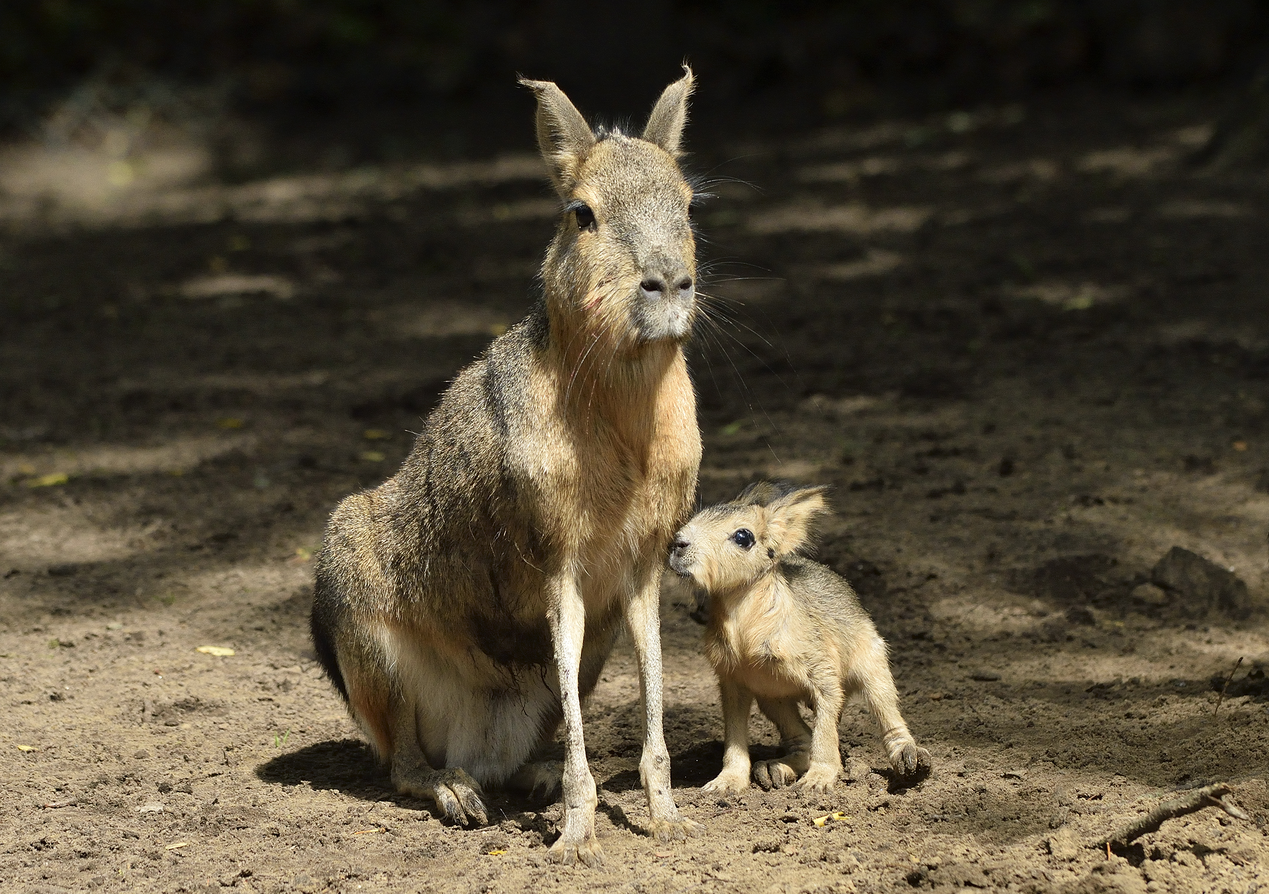 Die Maras oder Pampashasen (Dolichotis patagonum) sind Nagetiere aus der Verwandtschaft der Meerschweinchen. Sie bewohnen die Pampas Zentral- und Südargentiniens. Die großen Erdhöhlen, die nur die Weibchen graben, dienen allein als Kinderstuben. Mehrmals täglich lockt die Mutter ihre Jungen zum Säugen ans Tageslicht.