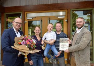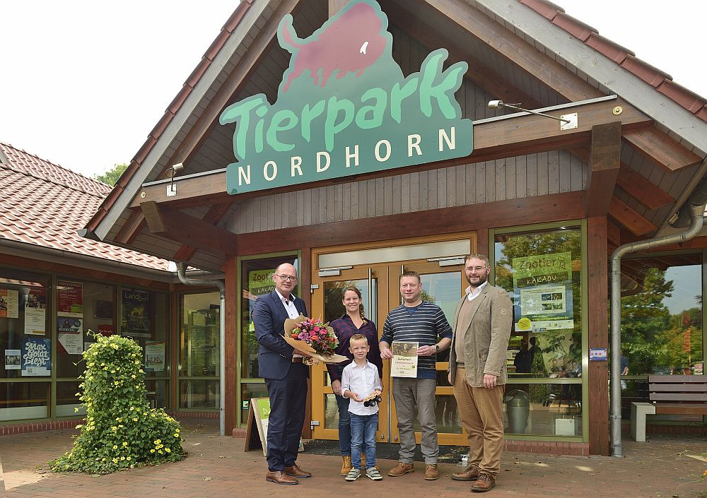 Für Familie van Dijk aus Enschede war die Überraschung groß. Anstatt an der Kasse des Tierparks Nordhorn die Eintrittskarten für den Zoobesuch zu erwerben wurden sie von Tierparkleiter Dr. Nils Kramer, und dem Vorsitzenden der Gesellschafterversammlung des Tierparks Uwe Fietzek mit einem Blumenstrauß und einer Jahreskarte für die ganze Familie im Eingangsbereich begrüßt. Sie waren die 333.333 ten Besucher, die in diesem Jahr den Zoo am Heseper Weg besuchten.
