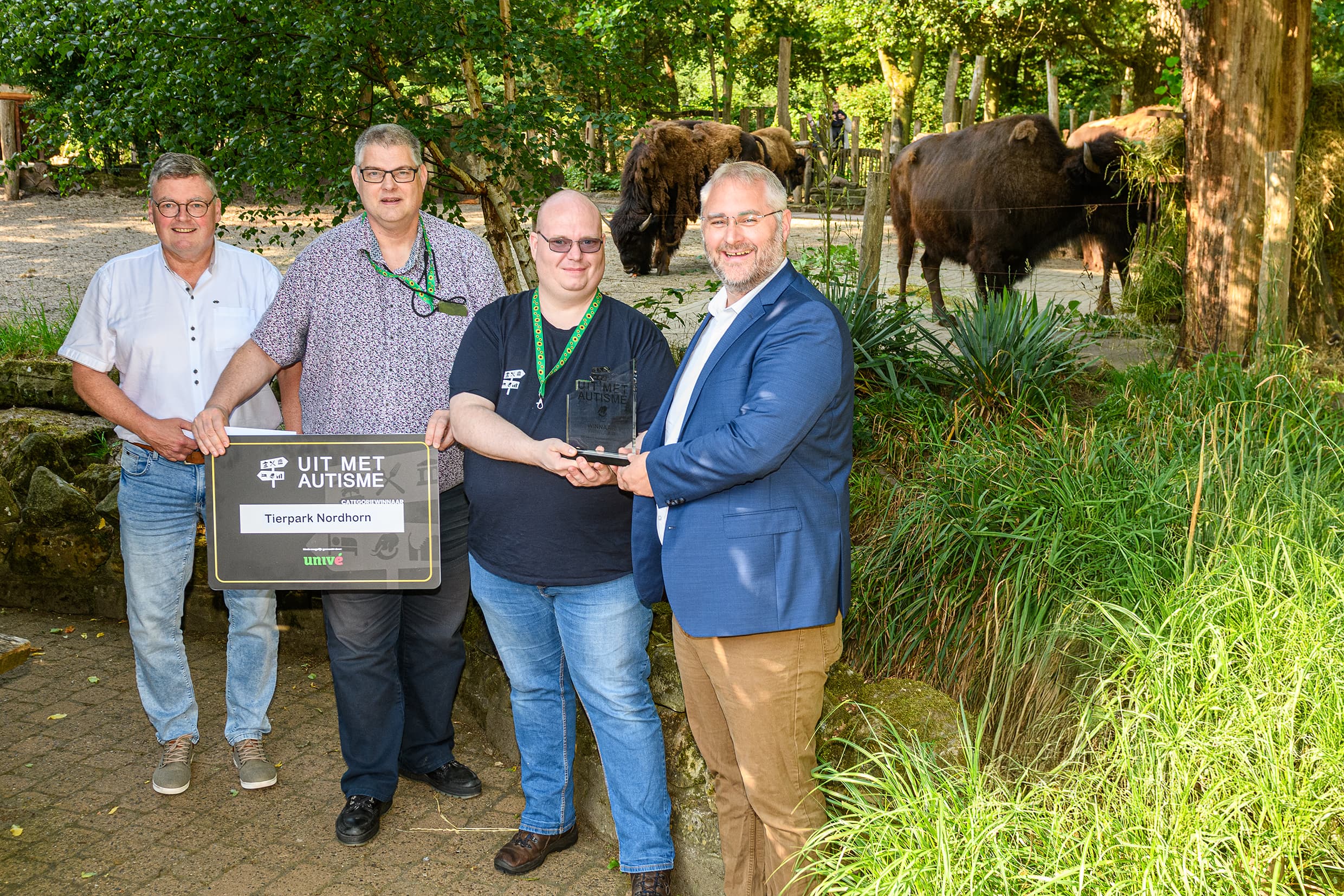 Die Preisverleihung im Familienzoo fand vor den Wappentieren, den stolzen Waldbisons statt. Hier überreichten der Initiator der Stiftung „Uit met Autisme“, Romano Sandee und Jurymitglied Raymond de Vries den Preis an den Tierparkleiter Dr. Nils Kramer und den Bürgermeister der Stadt Nordhorn, Thomas Berling.