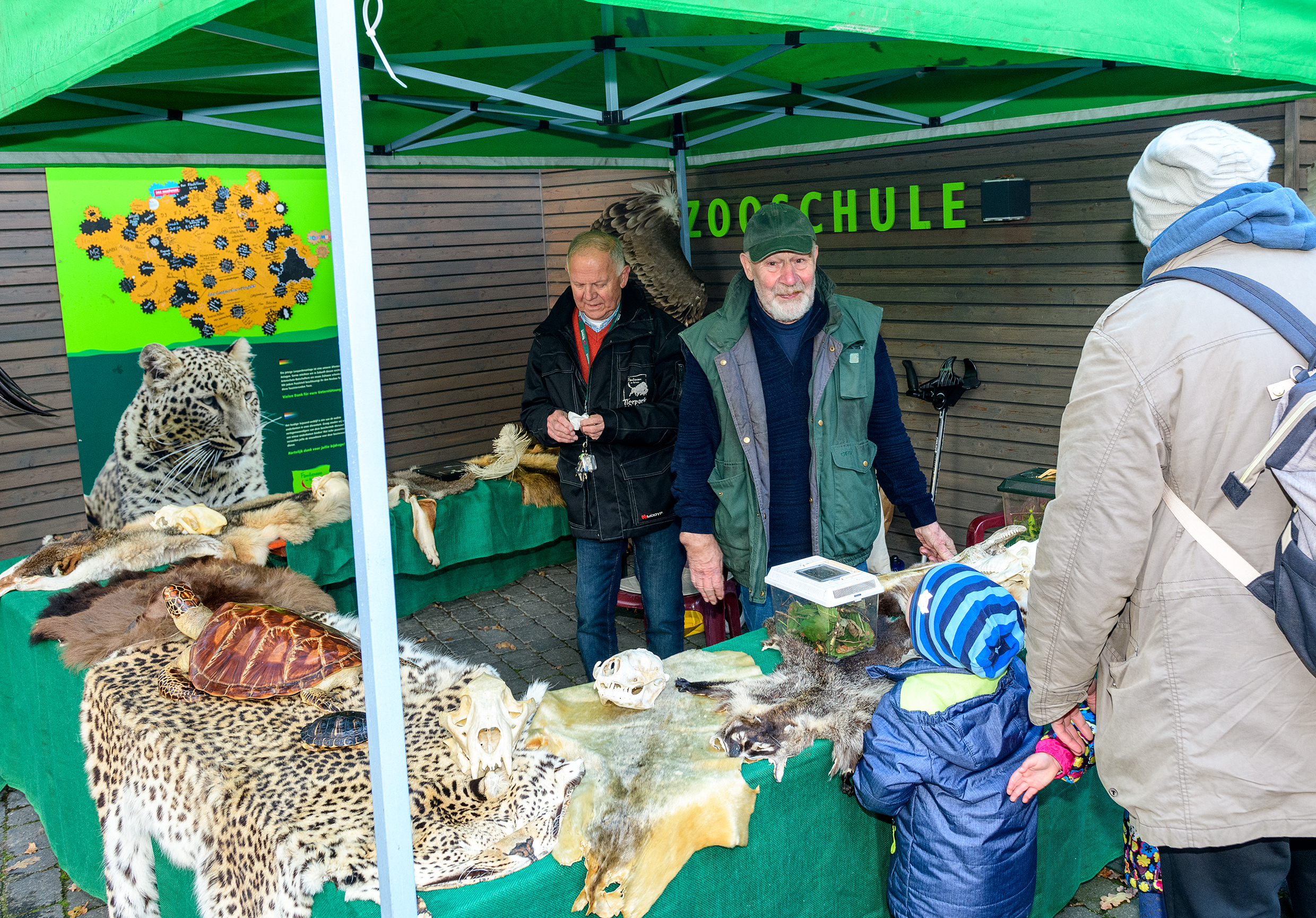 aktiv. Die Lose bei der großen Tombola des Fördervereins zugunsten des Neubaus der Leopardenanlage fanden reißenden Absatz. Die Informationsstände der Zooschule, der Grafschafter Naturschutzranger, der Jägerschaft gaben den Besuchern Einblick in die Arbeit des Tierparks. An einigen Stellen wurde ein „Blick hinter die Kulissen“ gewährt, wie zum Beispiel bei einer Futterausstellung in der Schau-Futterküche oder im Bisonstall.