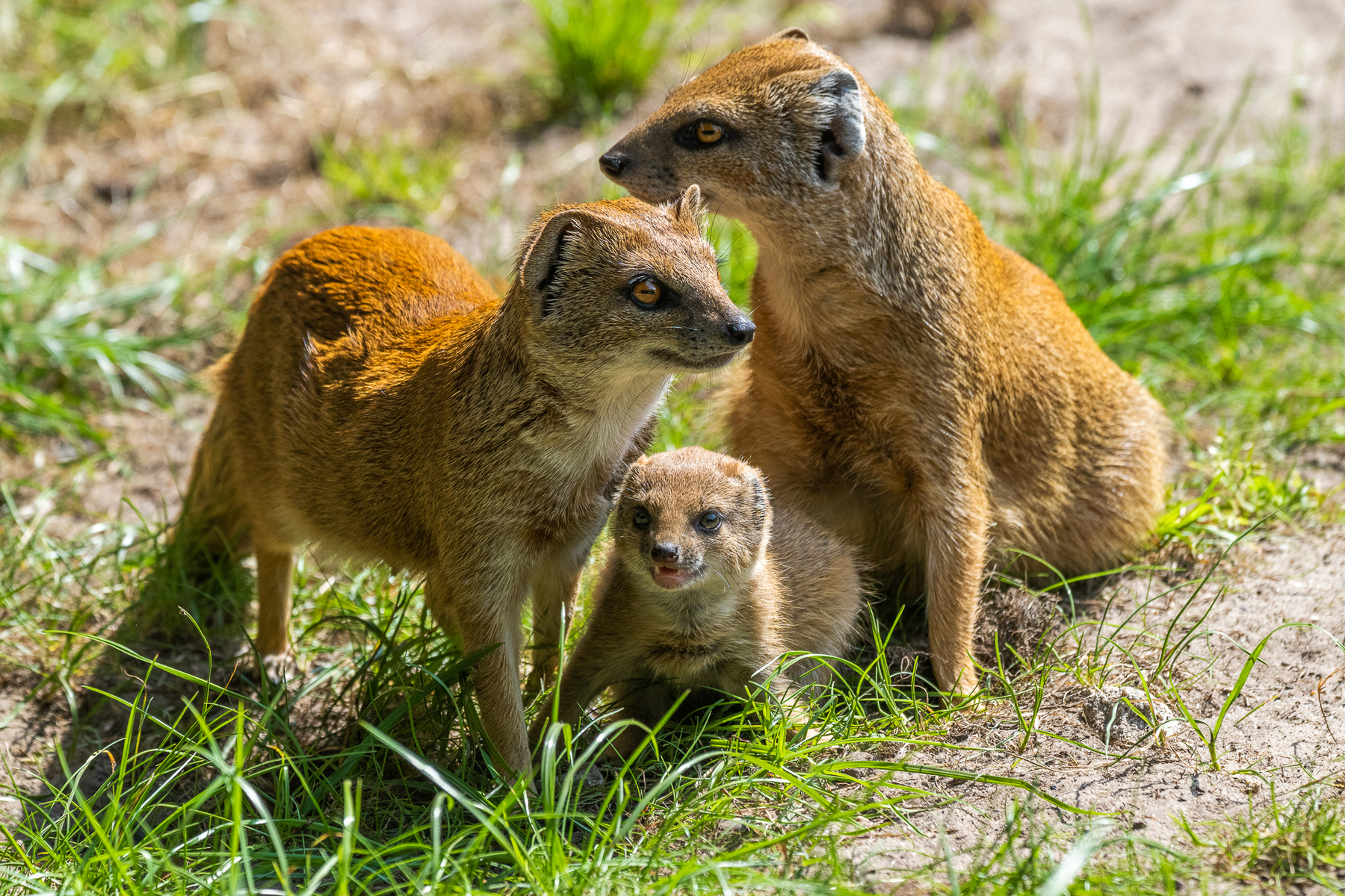 Bei den Fuchsmangusten ist das Futter allerdings weniger beliebt. Die Mitbewohner der fuchsähnlich aussehenden Mangusten, die Erdmännchen, werden häufig mit den Präriehunden verwechselt und bekommen die Heupellets daher zugeworfen. Dass das nicht so gut ankommt wird schnell klar, wenn man weiß, dass die Mangusten zu den Raubtieren gehören. Es sind also vorwiegend Fleischfresser, die Heu daher nicht wirklich zu schätzen wissen. Von Mitte Juni sind die drei kleinen Fuchsmangusten, die seit einigen Tagen vermehrt mit den Alttieren in der Außenanlage zu beobachten sind.
