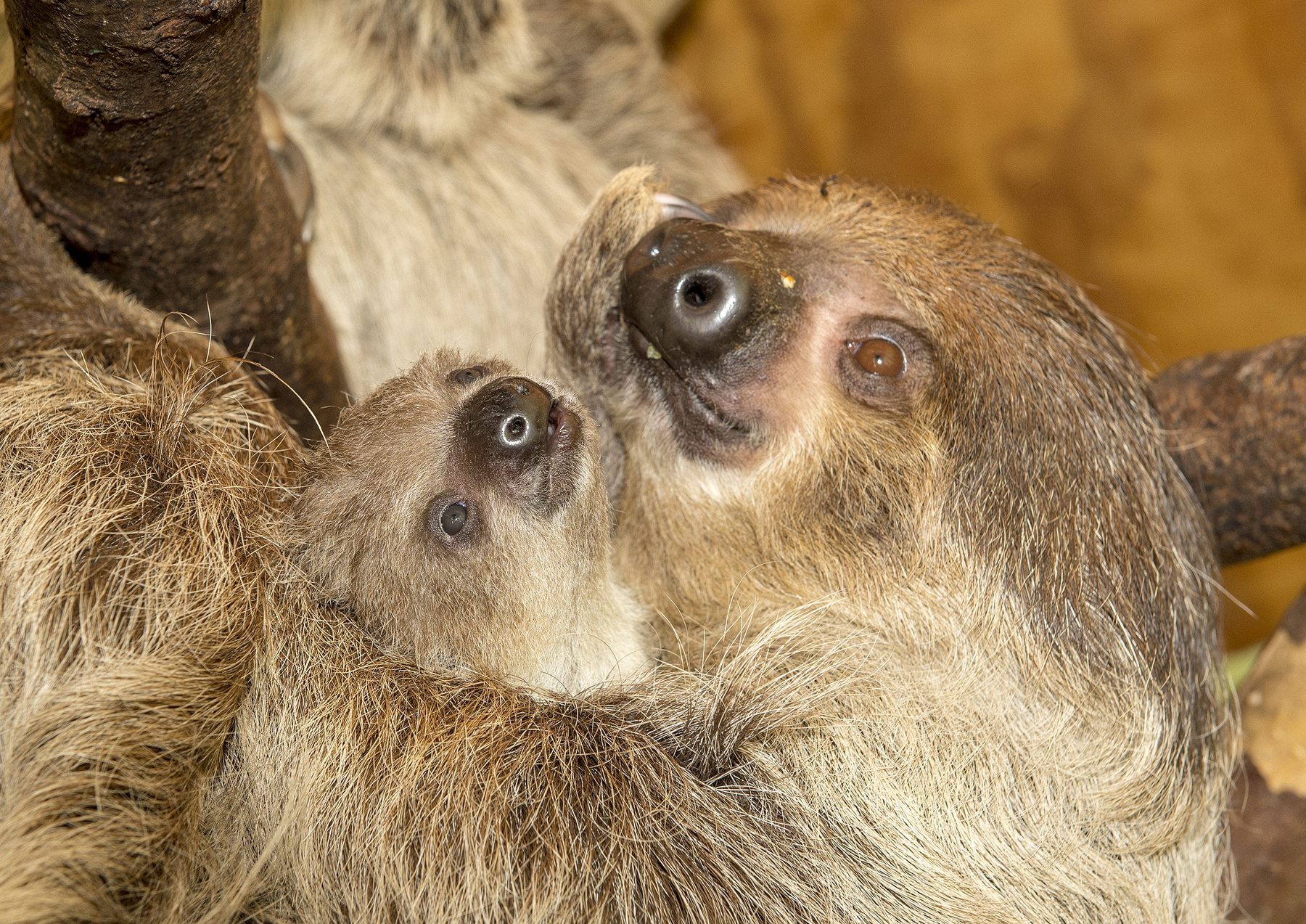 Dass sich die Zweifinger-Faultiere in unserem Familienzoo richtig wohl fühlen, zeigt die Regelmäßigkeit, mit der die beiden Weibchen „Gypsy“ und „Wutz“ für Nachwuchs sorgen. „Bei den Faultieren können wir absolut keine Saison für die Geburten ausmachen!“ so Revierleiterin Gwen Bron. „Wir bemerken, dass etwa 13-16 Monate nach einer Geburt das nächste Jungtier auf die Welt kommt,“ so Bron weiter und ergänzt schmunzelnd: „Die Paarung zwischen unserem Faultiermännchen „Sid“ und einem der Weibchen konnten wir noch nie beobachten. Das passiert immer nachts!“ Also ist es weiterhin jedes Mal eine kleine Überraschung, wenn morgens auf dem Bauch eines der Weibchen ein kleines Fellknäuel zu entdecken ist. Das aktuelle Jungtier brachte „Wutz“ am Mittwoch, den 21. Juli auf die Welt.