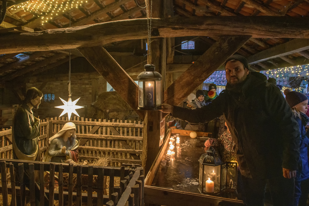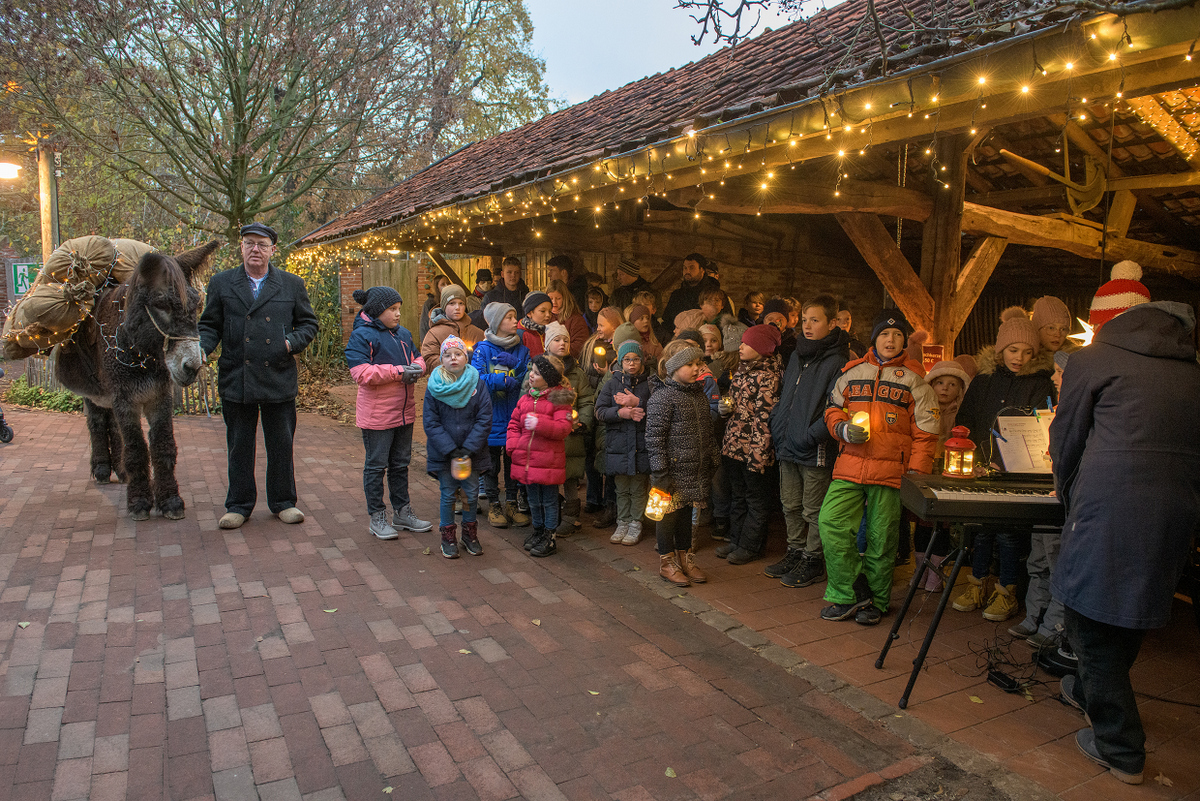 Es war ein gelungener Auftakt für den traditionellen Weihnachtsmarkt im Tierpark Nordhorn. Bauer Hinnerk zog mit dem beleuchteten Poitou-Esel „Titus“ um Punkt 16 Uhr mit den Pfadfindern und Kindern des ökumenischen Kinderchores Veldhausen/Osterwald zur lebenden Krippe. Manch ein Weihnachtslied erklang auf dem Weg vorbei an den Präriehunden, Bisons und Sikas. An der Krippe entzündeten die Pfadfinder zum Start des Weihnachtsmarktes das Wunschkerzenlicht und machten auf die Aktion „Friedenslicht“ aufmerksam.