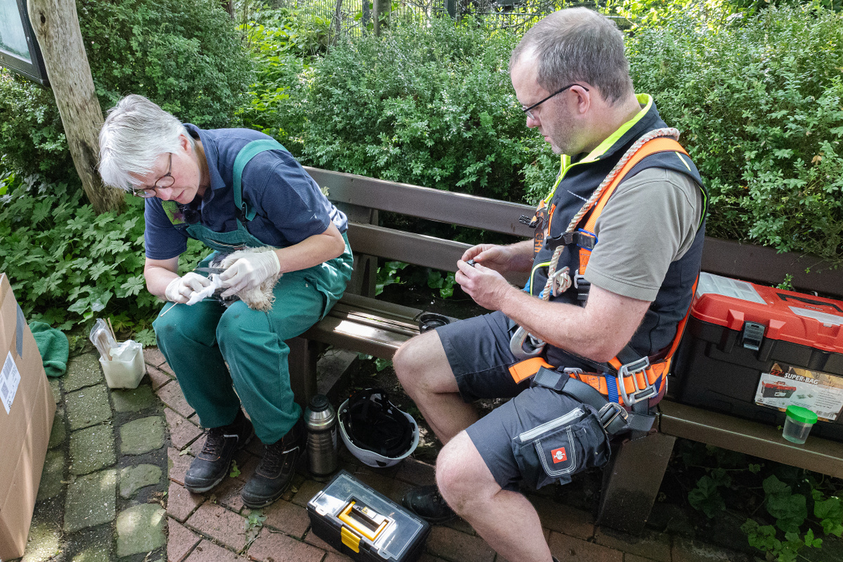 Bei der Beringungsaktion in dieser Woche konnten sich der Beringer Dr. Volker Blüml, der Weißstorchbetreuer für die Grafschaft Bentheim, Wilfried Jürges, und Zootierärztin Dr. Heike Weber in luftiger Höhe ein Bild von der Situation machen.