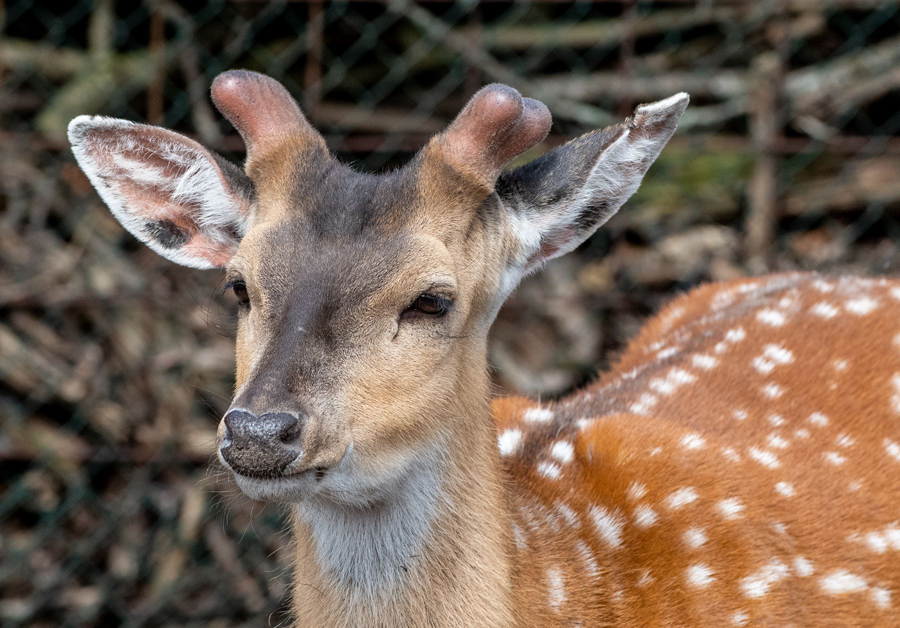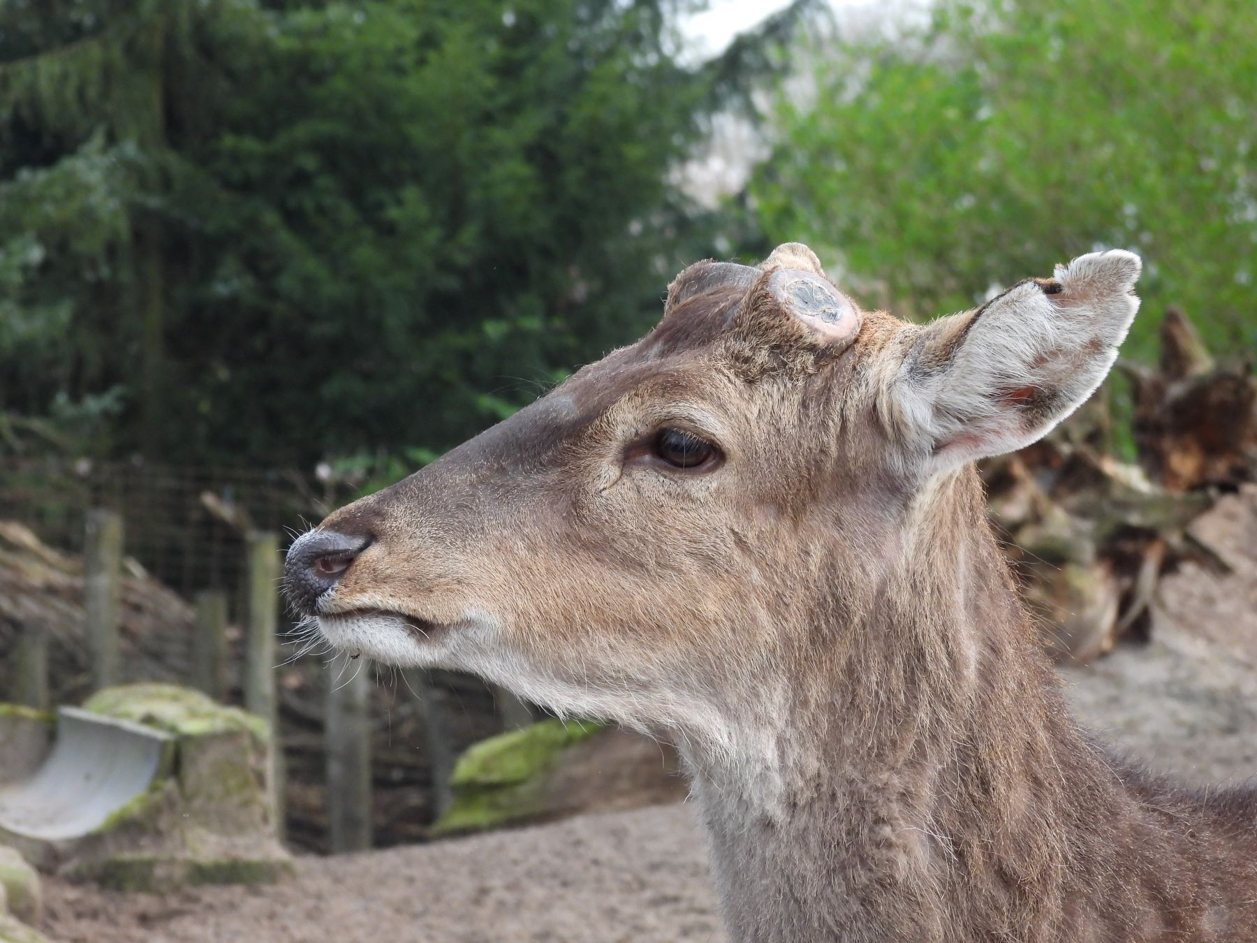 1/ Tierparkarchiv: Vietnam-Sika Hirsch Siegfried im Frühjahr direkt nach dem Abwurf seiner beiden Geweihstangen. Auf den Rosenstockenden sieht man die glatte Abwurffläche.