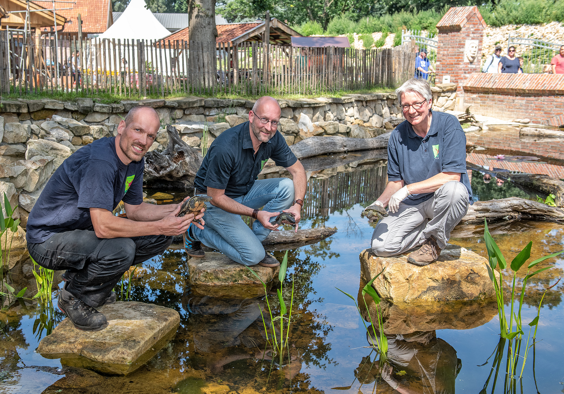 Im Zuge der Baumaßnahmen im Bereich des neuen „Vechtedorfes“ wurde im Jahr 2019 ein größerer Teich mit geeigneten Eiablageplätzen für die Erhaltungszucht von Schildkröten geplant und mit den Baumaßnahmen begonnen. Im Frühjahr 2020 konnte der Teich im Übergang vom historischen Bereich in den exotischen Teil des Zoos fertig gestellt werden. Die Suche nach ausgewachsenen Tieren des geeigneten Schildkrötentyps zur Wiederansiedlung gestaltete sich recht schwierig, da er recht selten ist. Aber einige private Züchter, die sich mit Ihren Nachzuchttieren ebenfalls an dem Wiederansiedlungsprojekt beteiligen, konnten helfen. „Nach langer Suche hatten wir endlich Glück und konnten von einem sehr erfahrenen langjährigen Züchter und Mitstreiter des Projektes, ein Männchen und zwei Weibchen erwerben“, freut sich Weber. Die Ankunft der drei Tiere wurde von den zufällig anwesenden Besuchern mit Spannung verfolgt. Nach der erforderlichen Vermessung und dem Anfertigen von Identifikationsfotos durch Tierparkfotograf Franz Frieling, wurden die wendigen Reptilien in ihr neues Refugium eingesetzt. „Es ist schön zu sehen, wie gut die neuen Zoobewohner hier in der Grafschaft angekommen sind und ihr neues Reich in Augenschein nehmen,“ so Dr. Dirk Wewers, der seit April als Kurator und Inspektor im Nordhorner Tierpark arbeitet. „Wir haben natürlich ein Interesse daran den Tierbestand um möglichst viele bedrohte, interessante Tierarten zu erweitern, denn die erfolgreiche