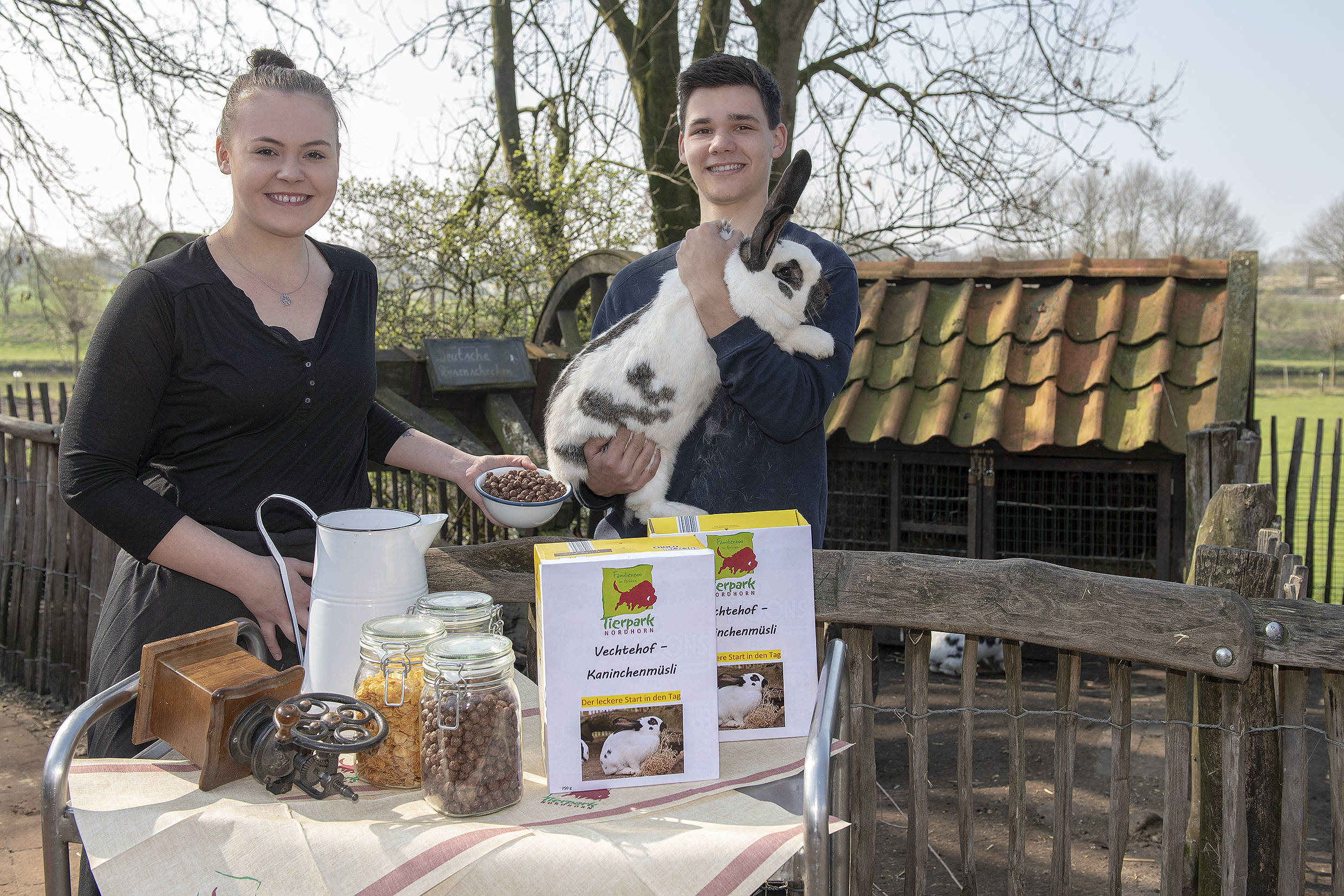 Was als Azubiprojekt genau vor genau einem Jahr gestartet ist, wird heute, am 1. April, voller Stolz von den beiden beteiligten Auszubildenden des Tierparks präsentiert. Die Kaninchen am historischen Vechtehof sorgen zukünftig für ein reichhaltiges Frühstücksmüsli im tierparkeigenen Gasthaus „De MalleJan“.